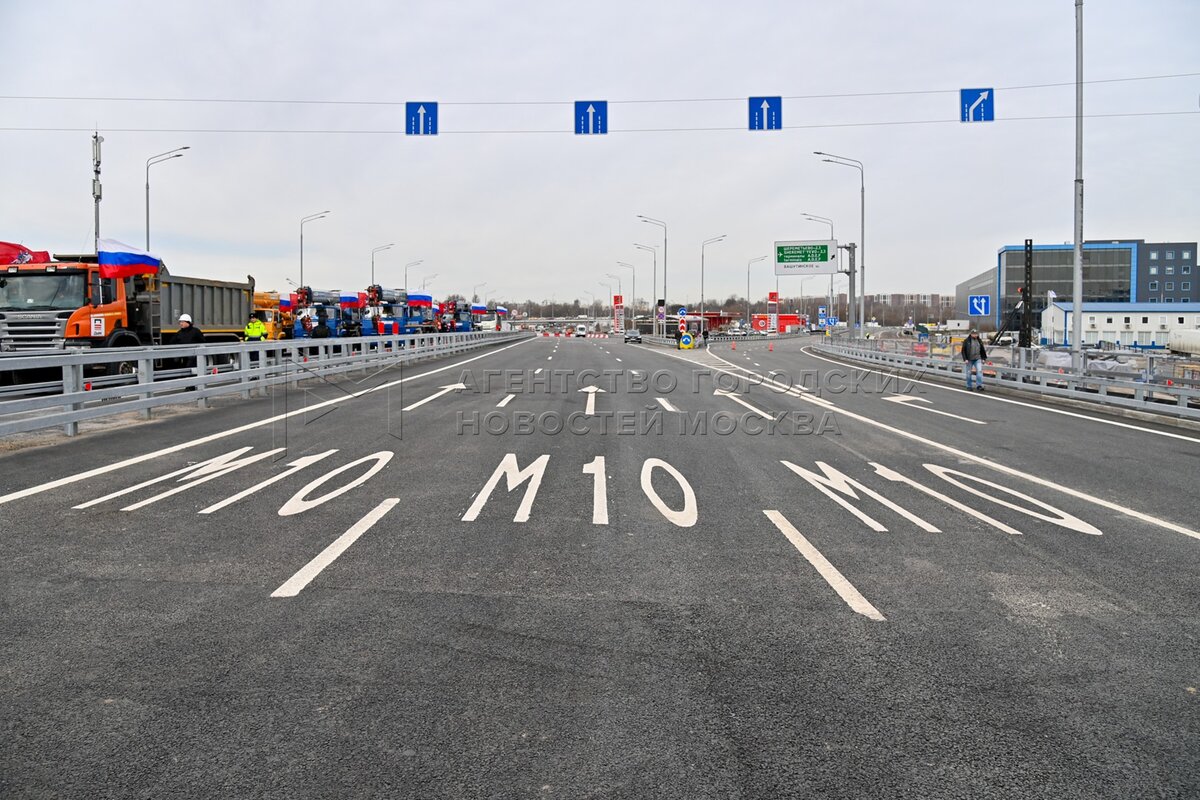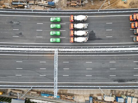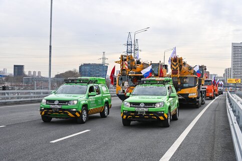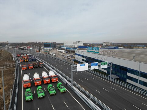 Колонна автомобилей и техники на открытии движения по путепроводу через пути МЦД-...