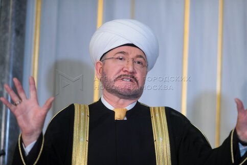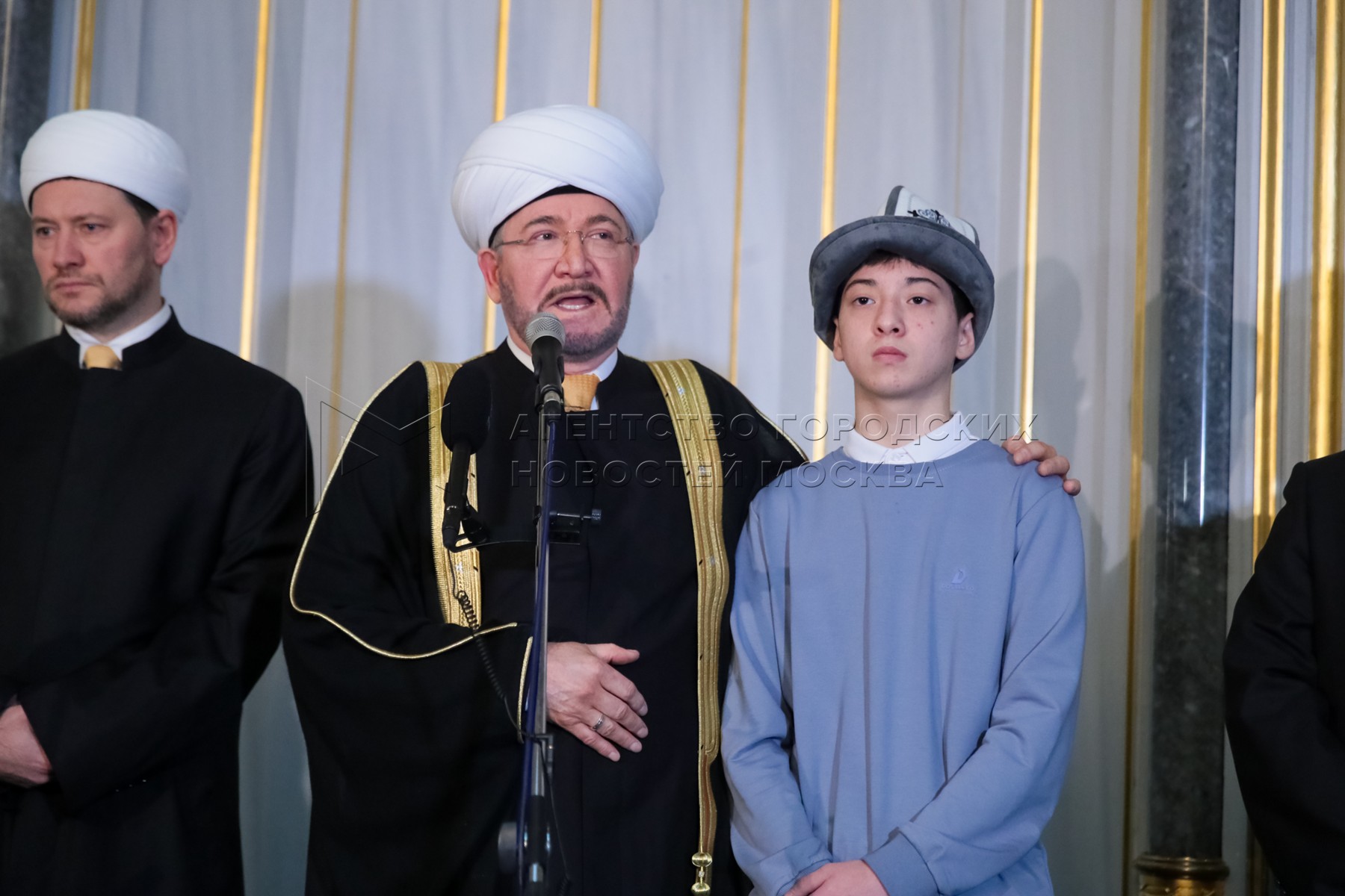 - Описание: Председатель Совета муфтиев России Равиль Гайнутдин и школьник Ислам Халилов на церемонии вручения Халилову медали мусульман России «За заслуги» за смелость и спасение людей во время теракта в Crocus City Hall.