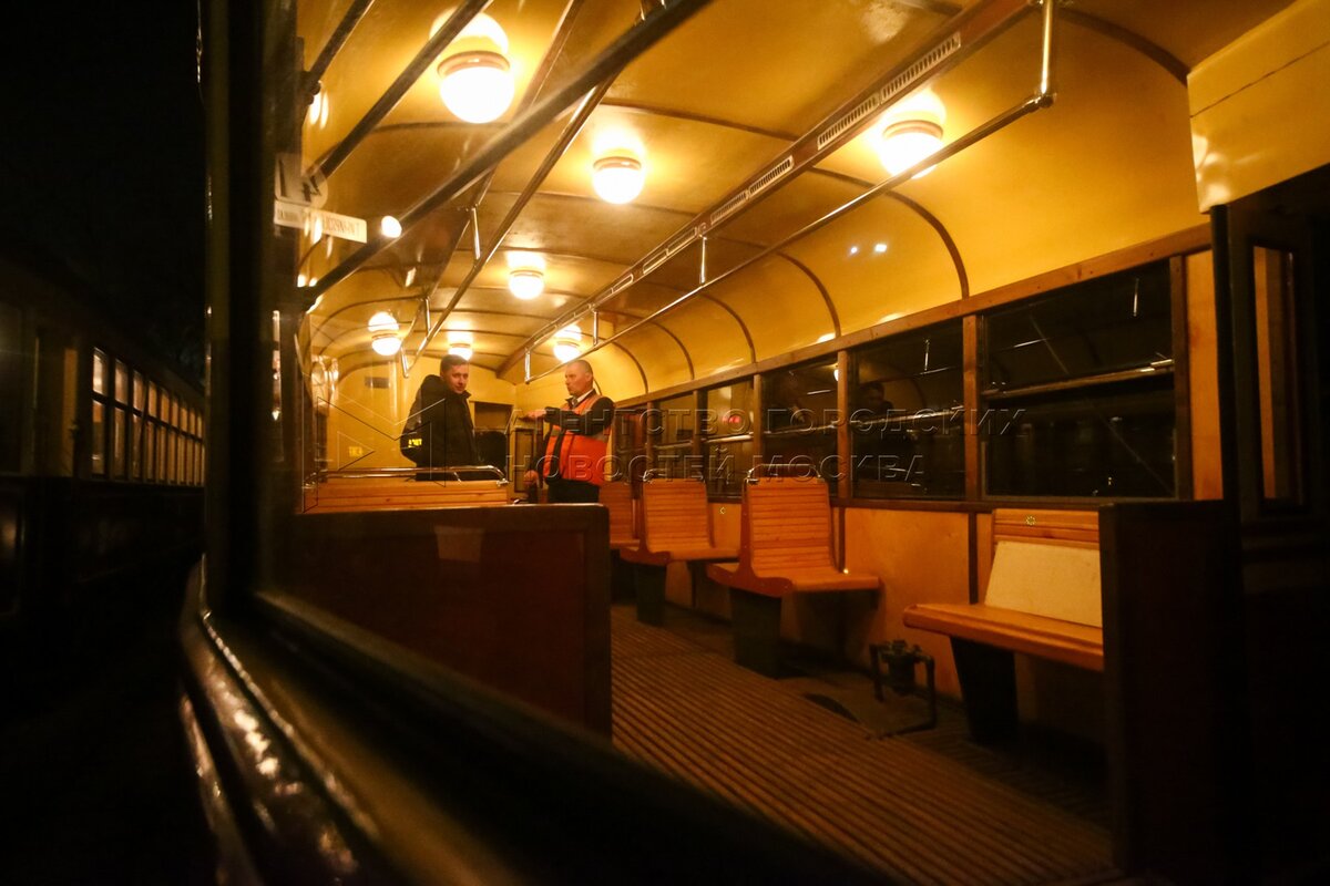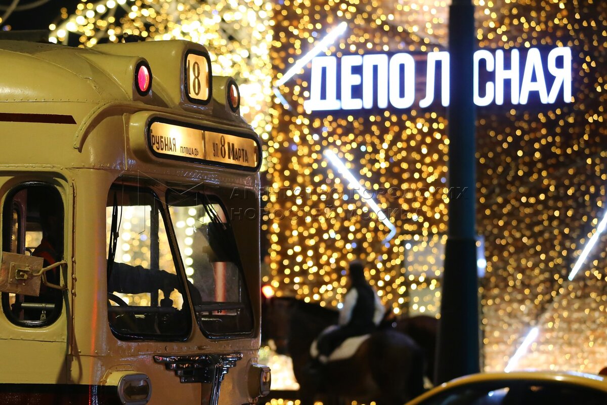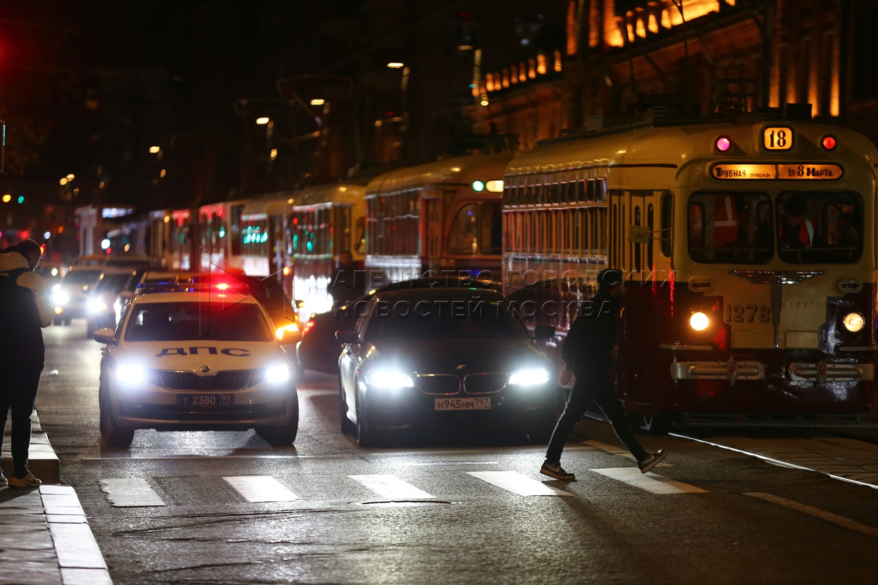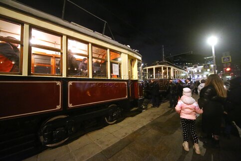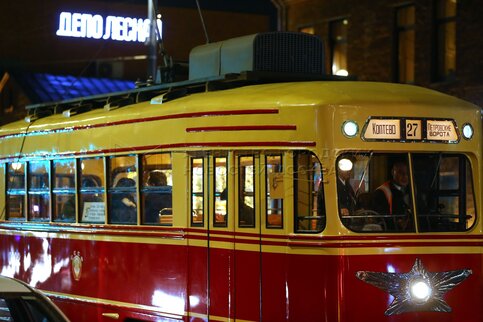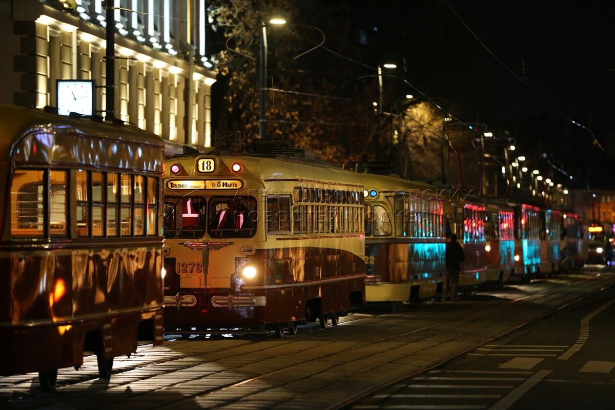 • Описание: Ночная репетиция парада трамваев в Москве.