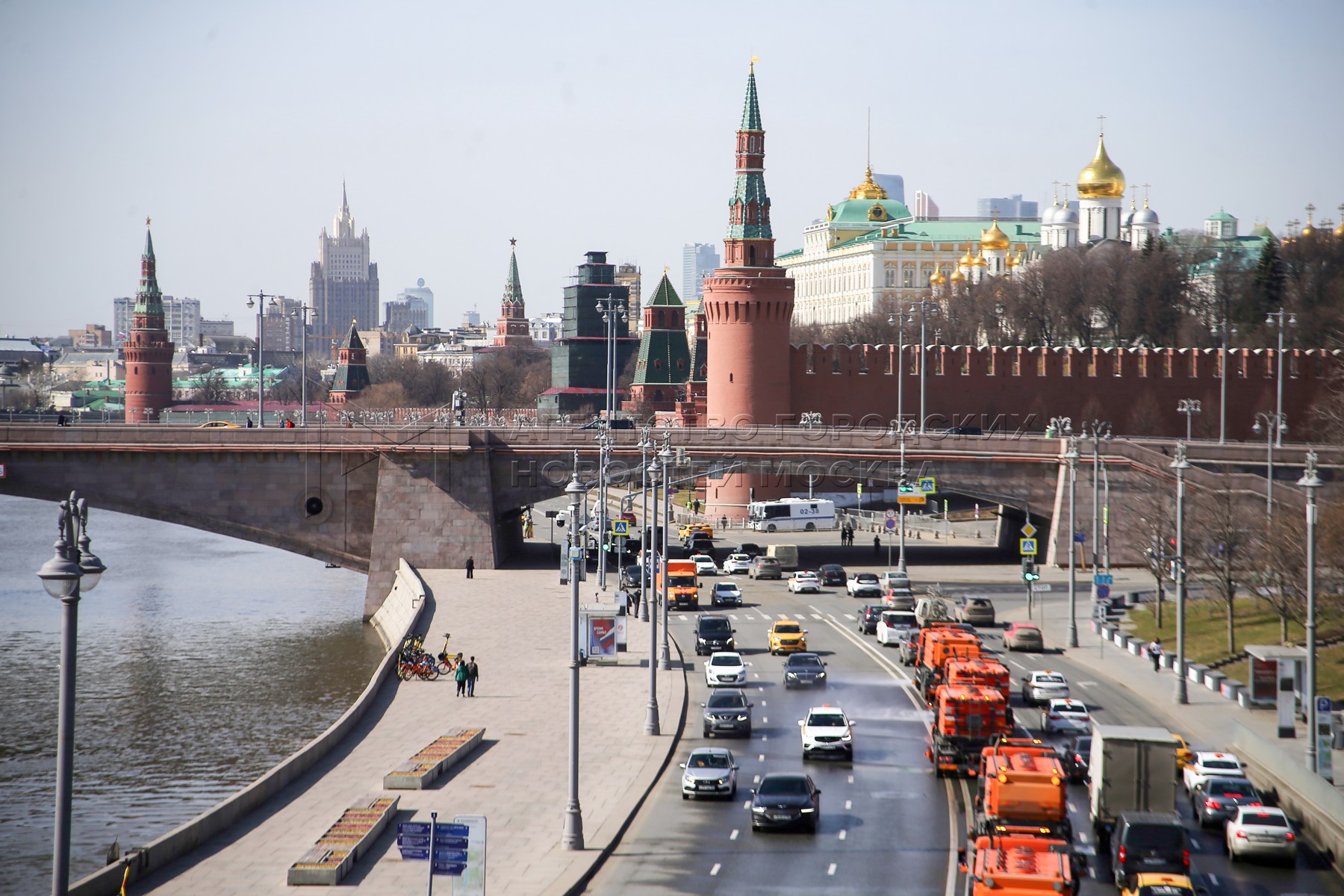 Теплая погода в Москве 1 апреля 2024 года. Москворецкая набережная и вид на Кремл...