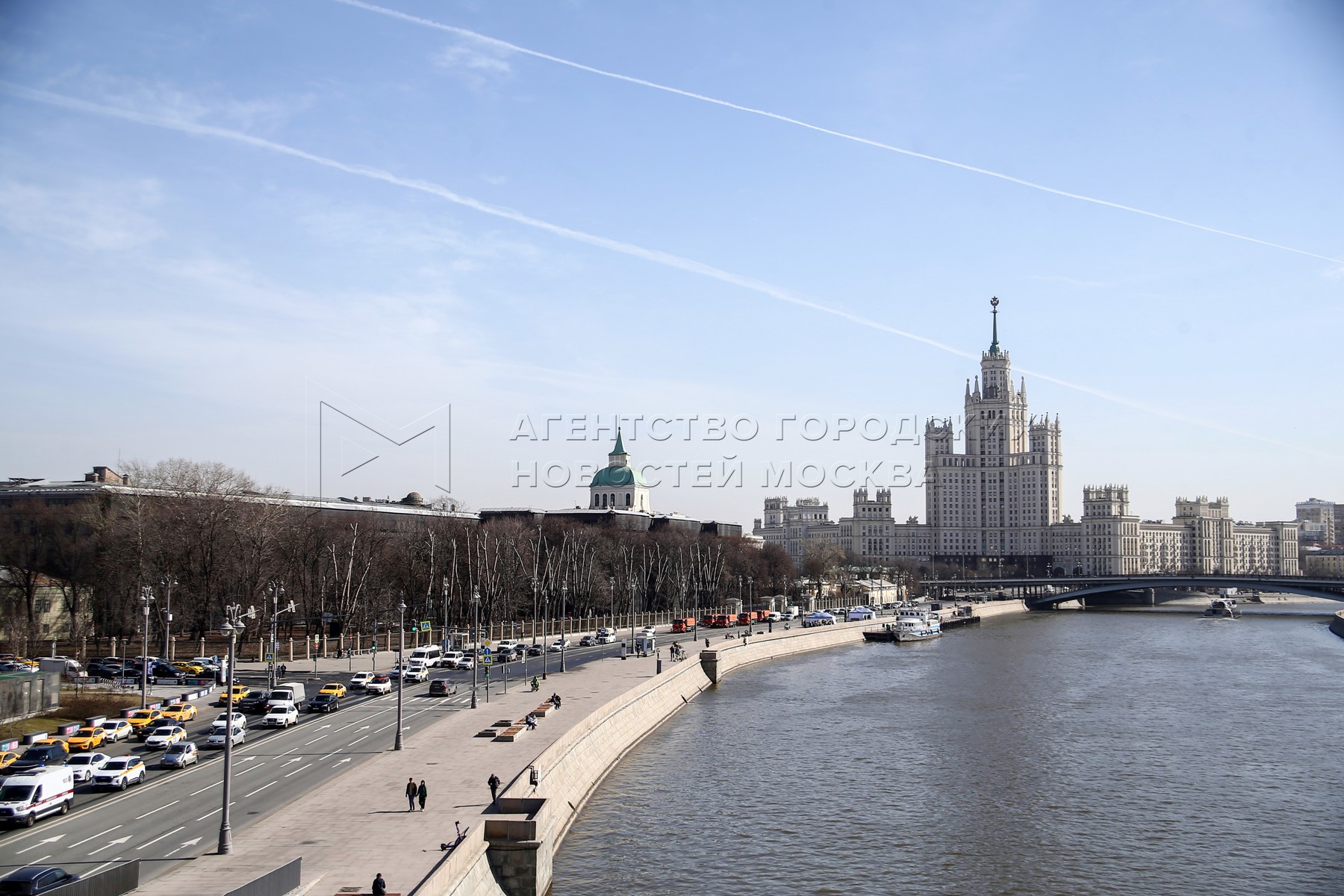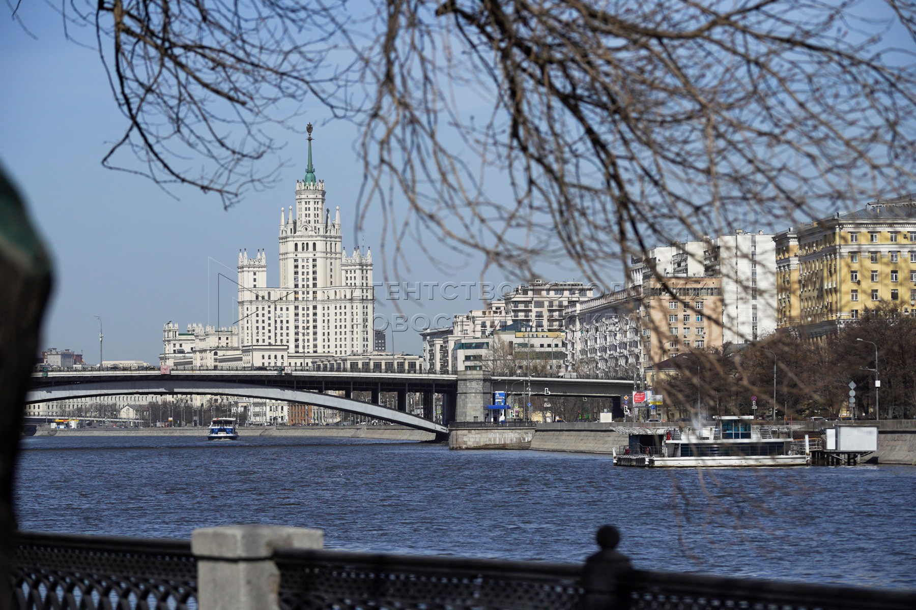 Теплая погода в Москве 1 апреля 2024 года. Москворецкая набережная и вид на высот...