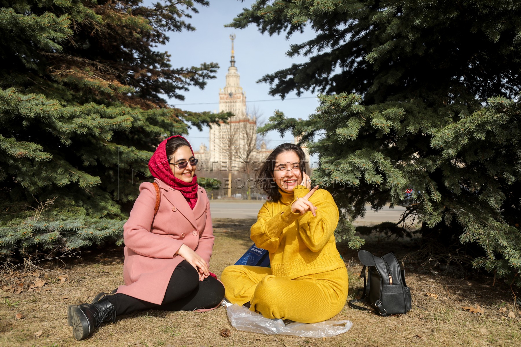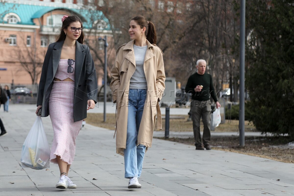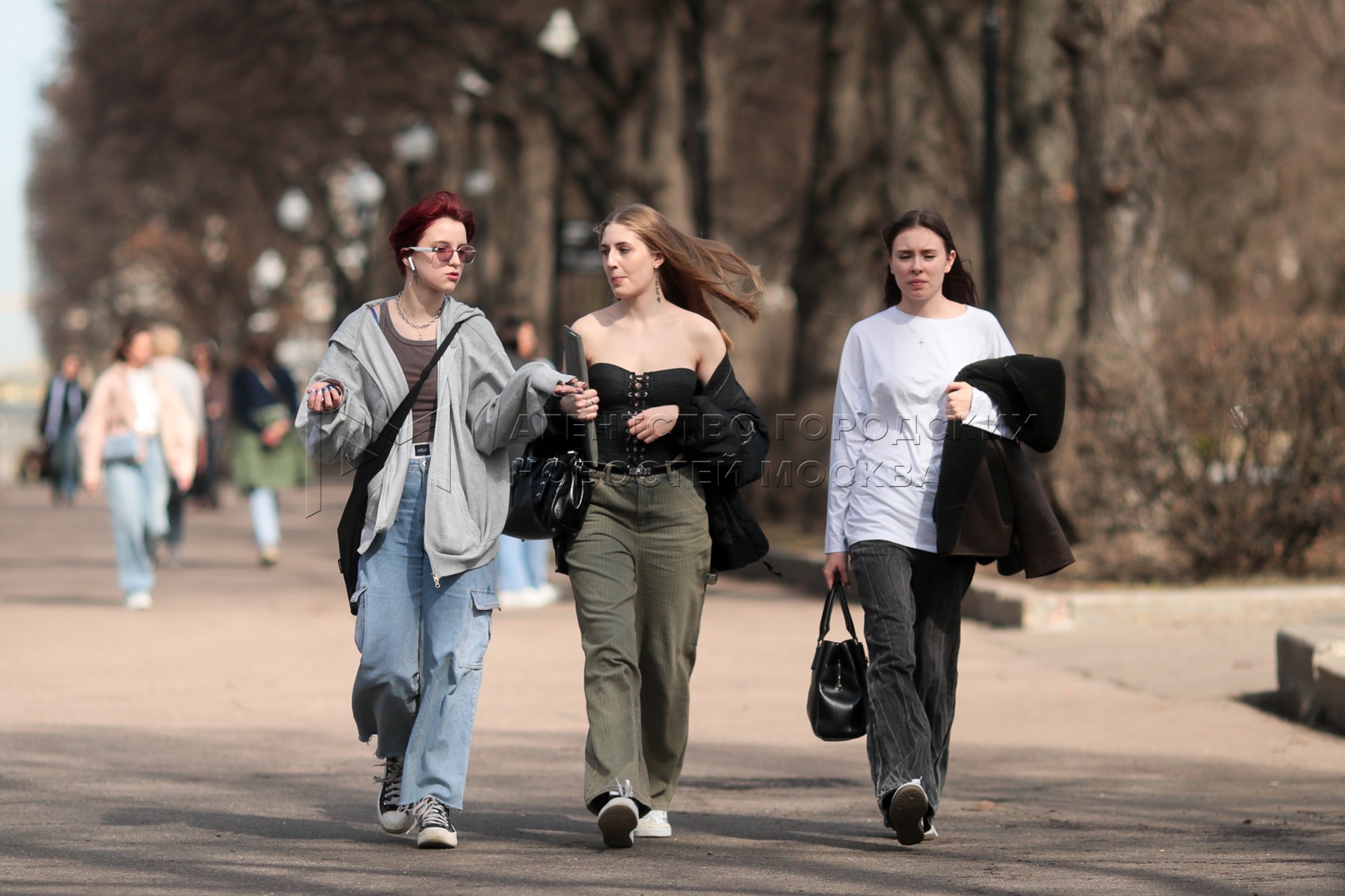Теплая погода в Москве 1 апреля 2024 года. Девушки с картонными стаканами с напит...