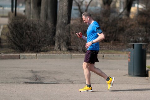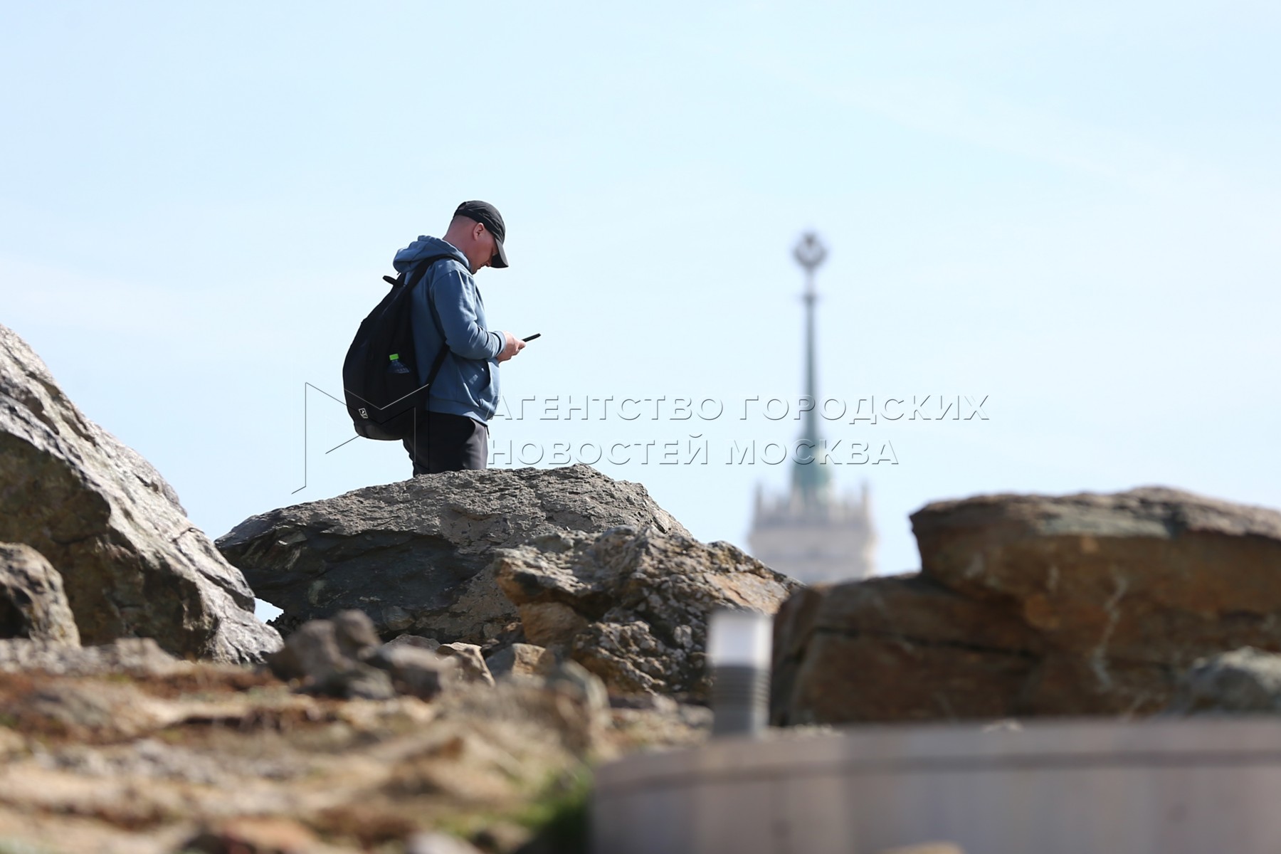 Теплая погода в Москве 1 апреля 2024 года. Мужчина с мобильным телефоном во время...