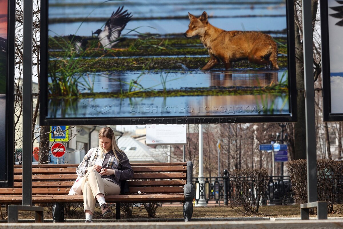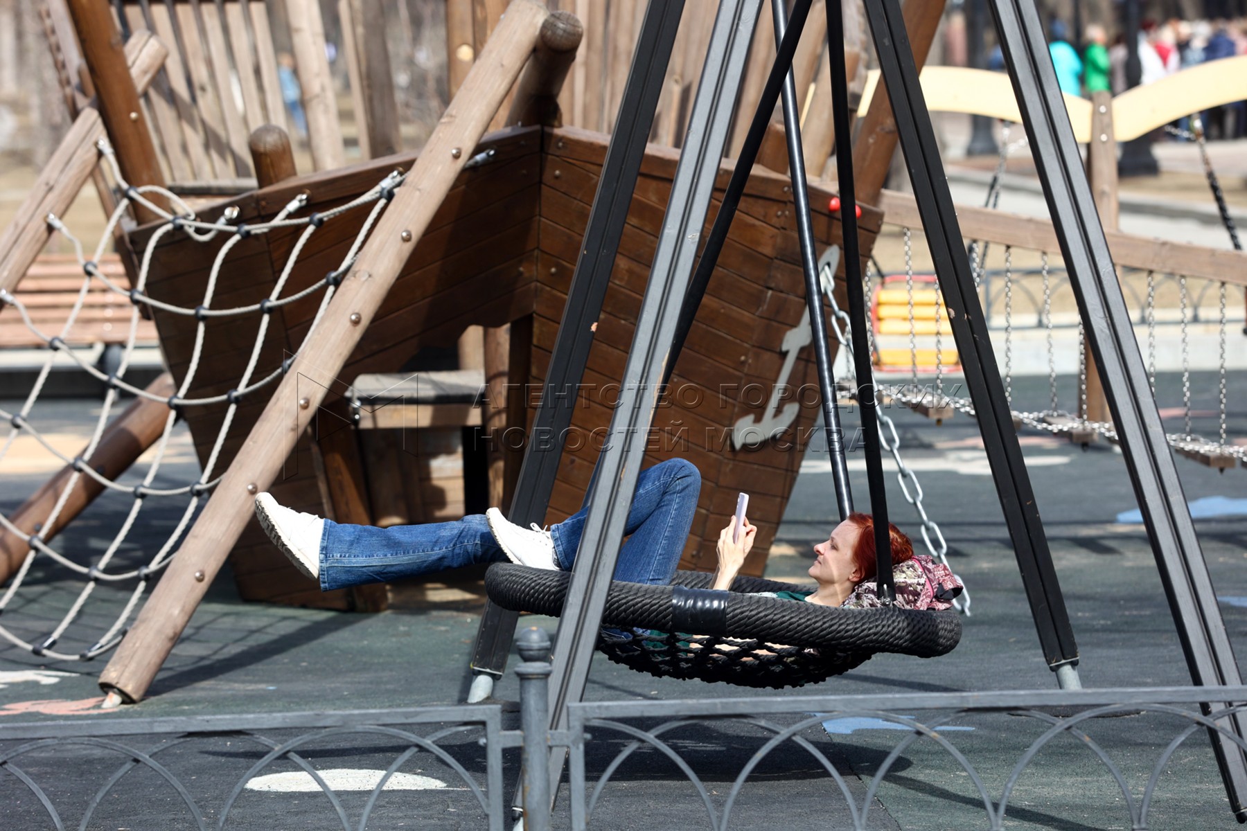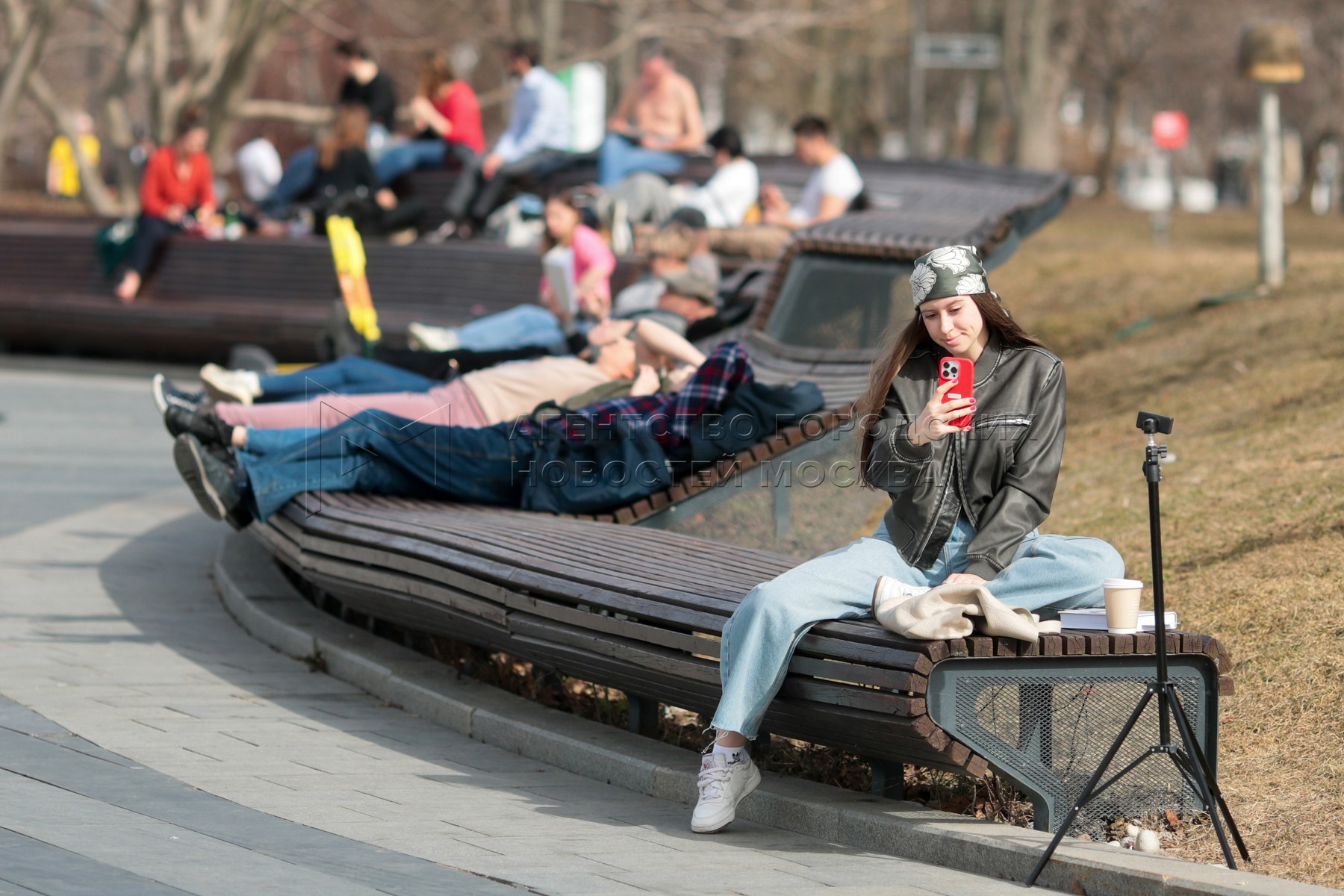 Теплая погода в Москве 1 апреля 2024 года. Женщина с мобильным телефоном отдыхает...