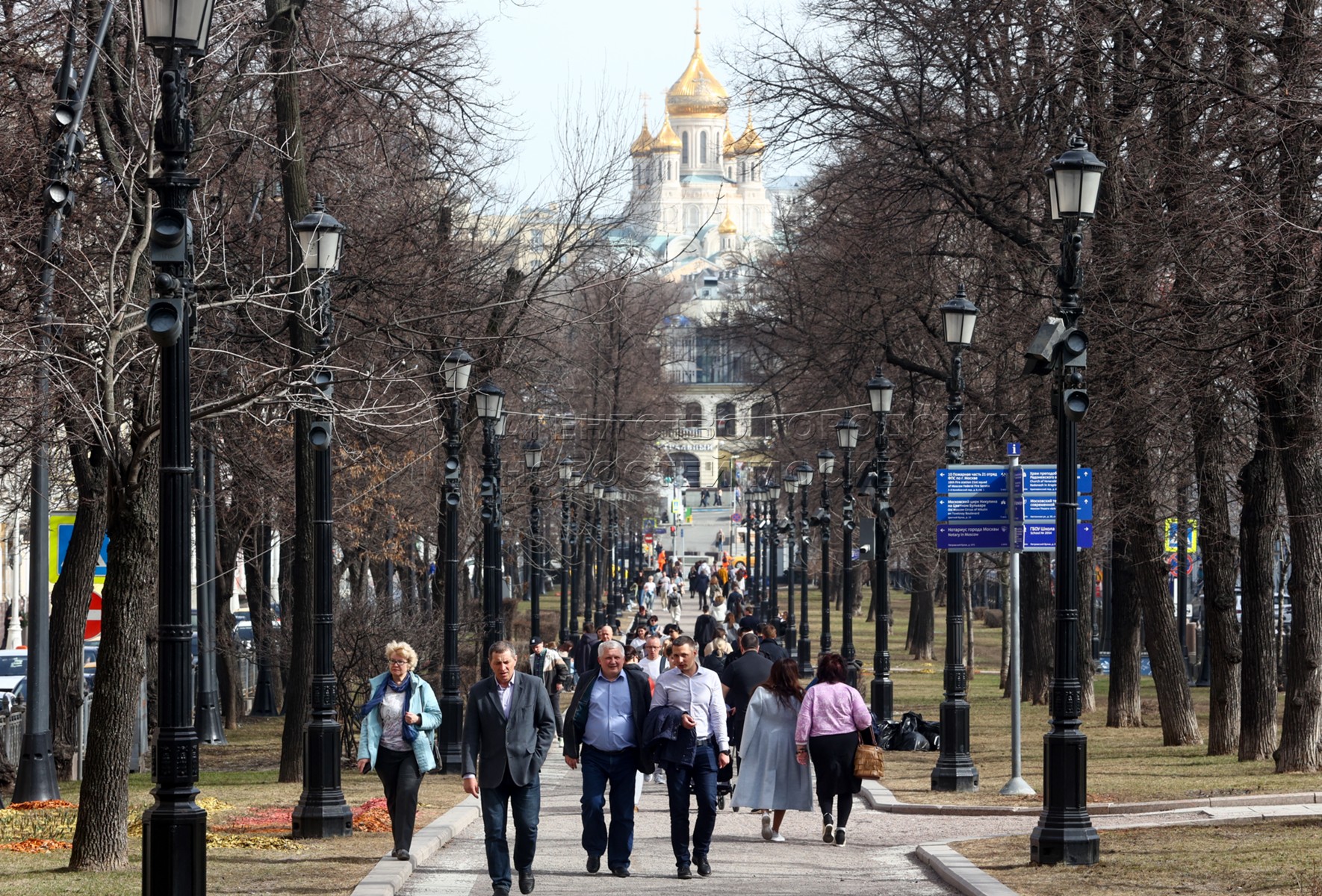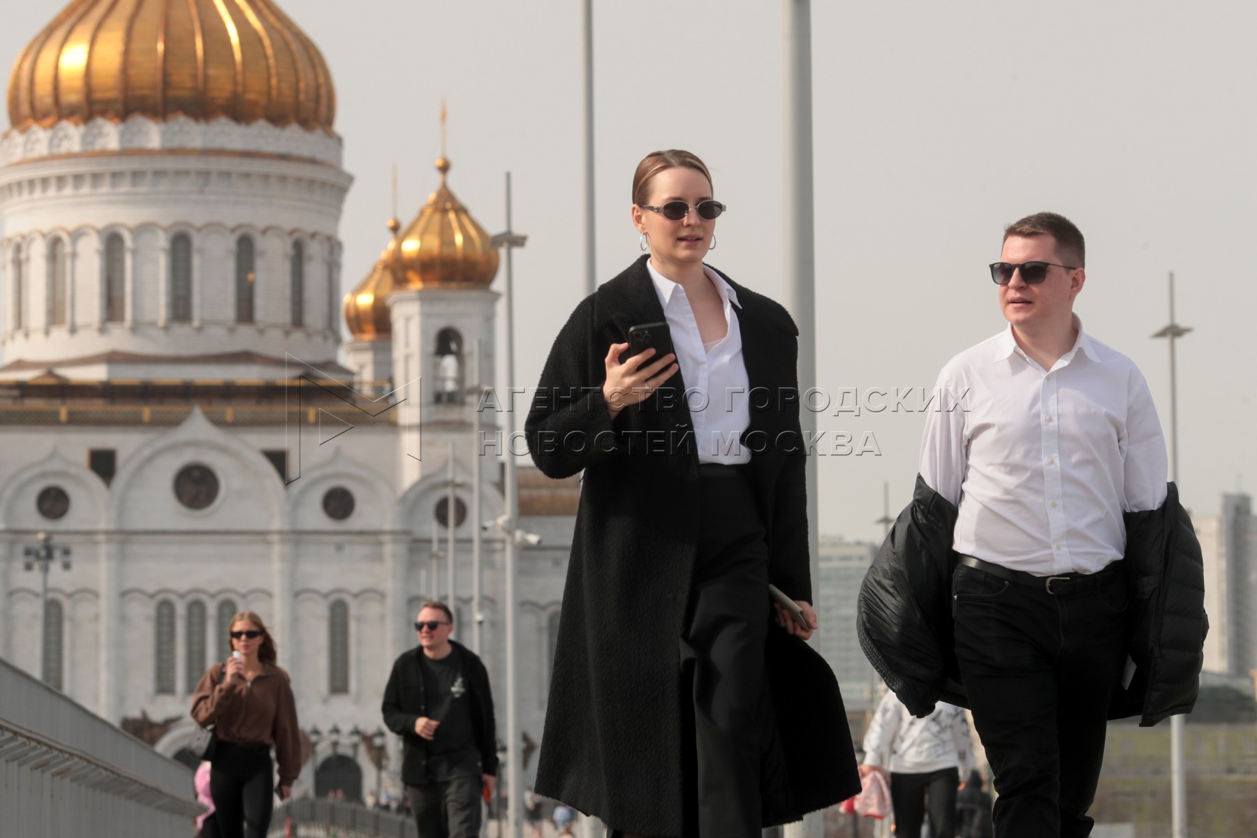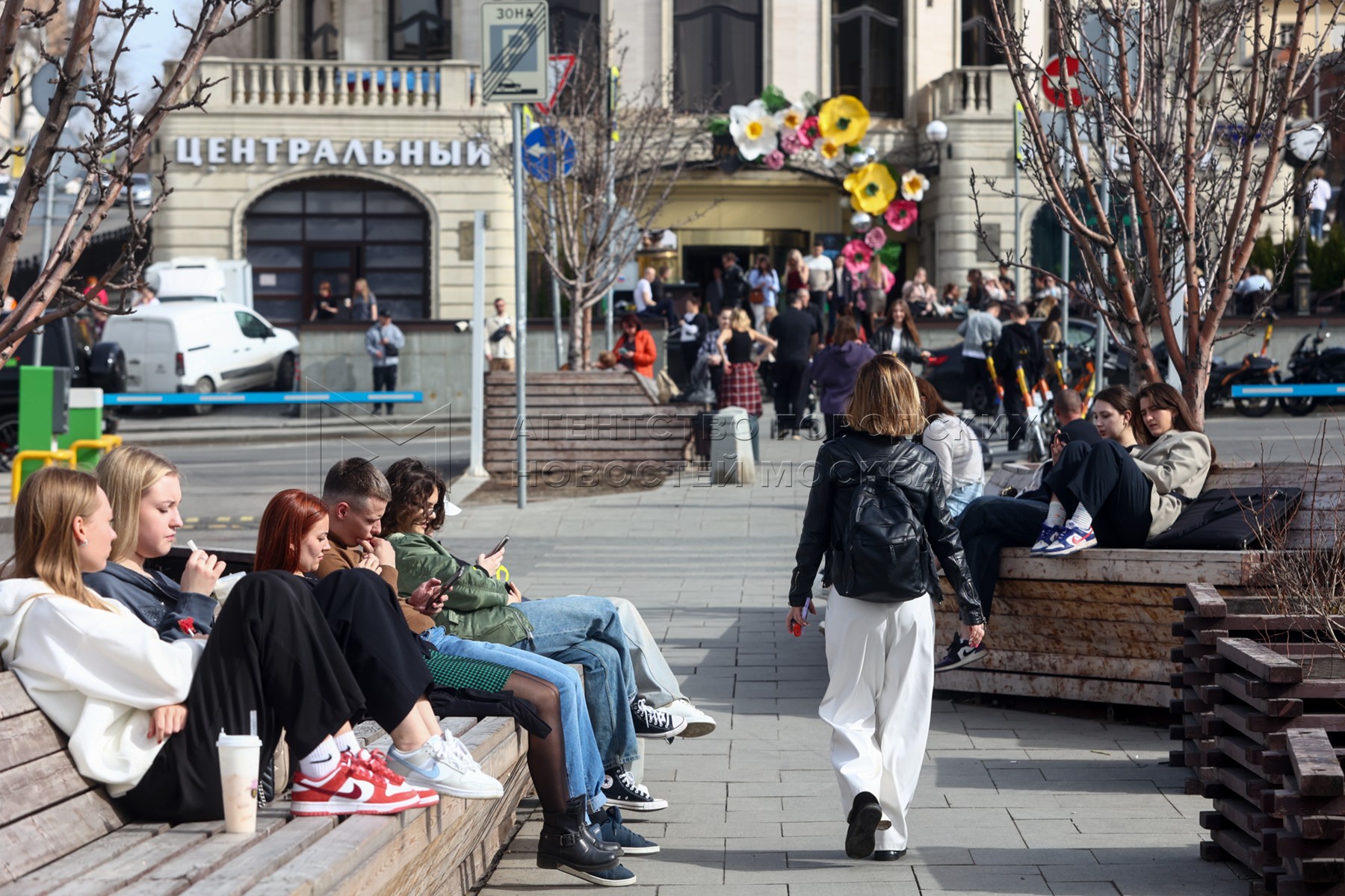 Теплая погода в Москве 1 апреля 2024 года. Горожане с мобильными телефонами в пар...