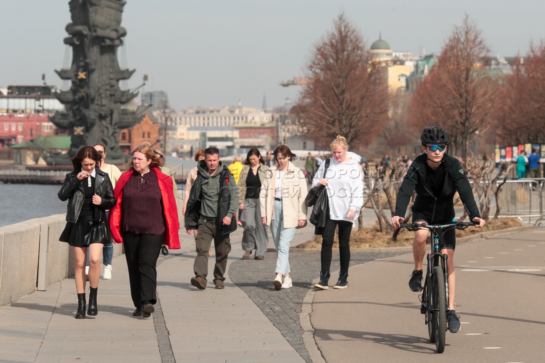 Теплая погода в Москве 1 апреля 2024 года. Памятник Петру I. Отдых горожан в парк...