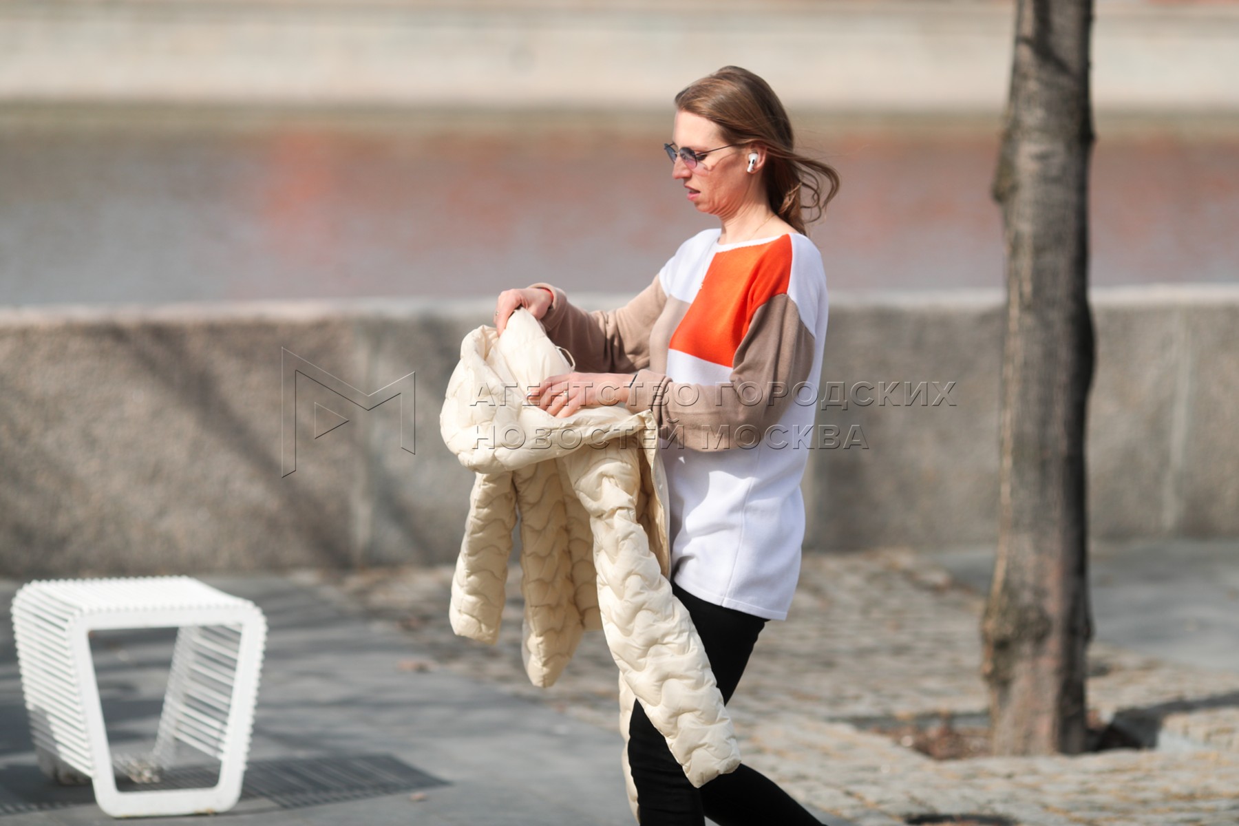 Теплая погода в Москве 1 апреля 2024 года. Девушка с мобильным телефоном.