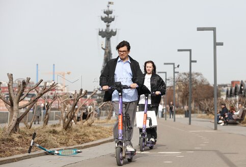 Теплая погода в Москве 1 апреля 2024 года. Девушка на электросамокате.