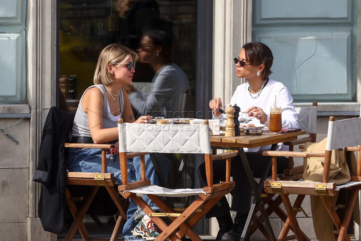 Теплая погода в Москве 1 апреля 2024 года. Девушки на летней веранде ресторана.