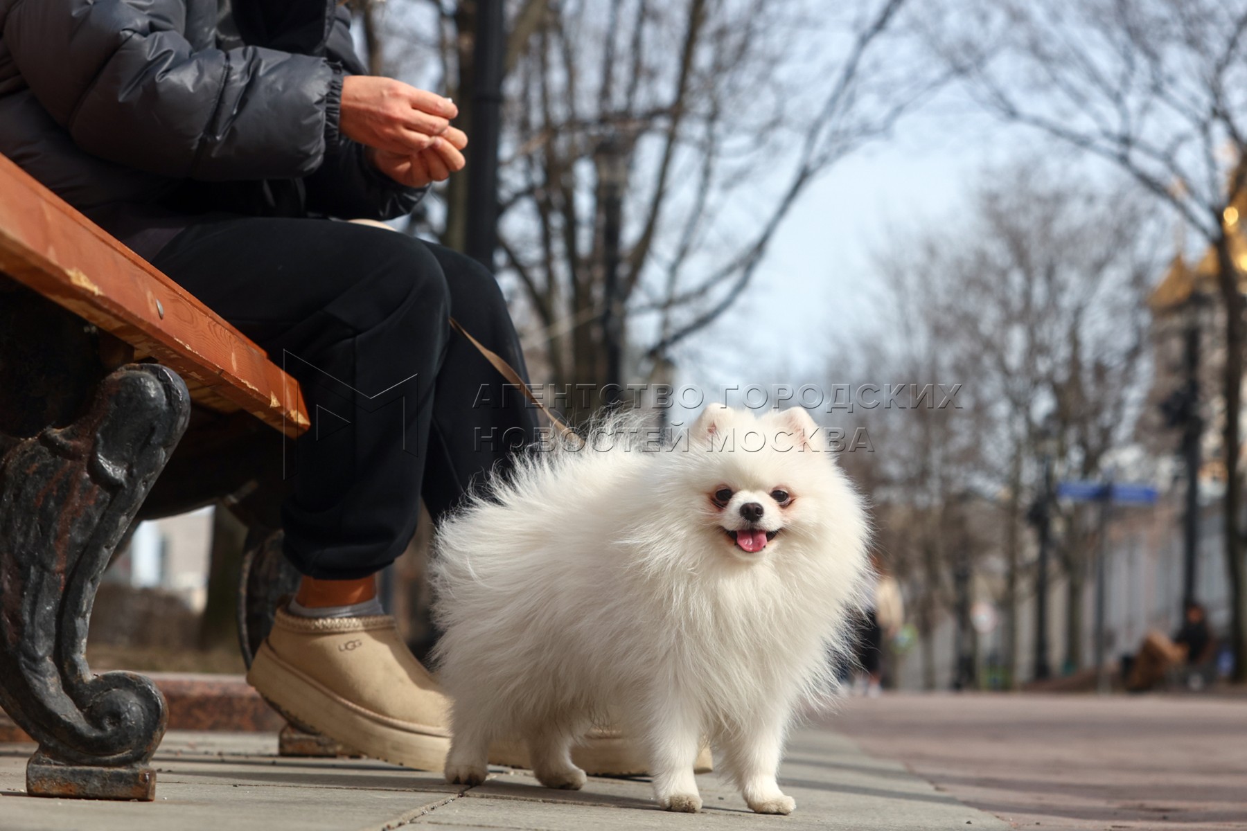 Теплая погода в Москве 1 апреля 2024 года. Собака породы шпиц.