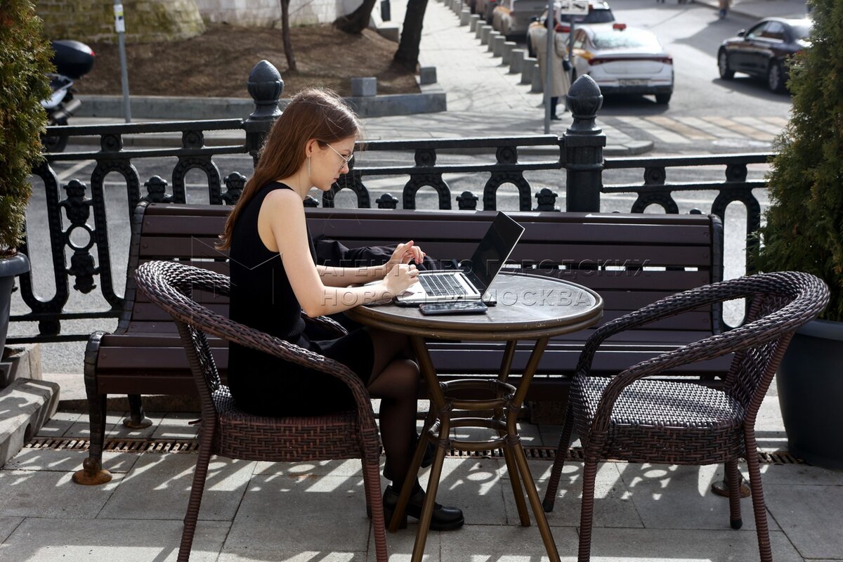 Теплая погода в Москве 1 апреля 2024 года. Девушка за столиком уличного кафе с но...