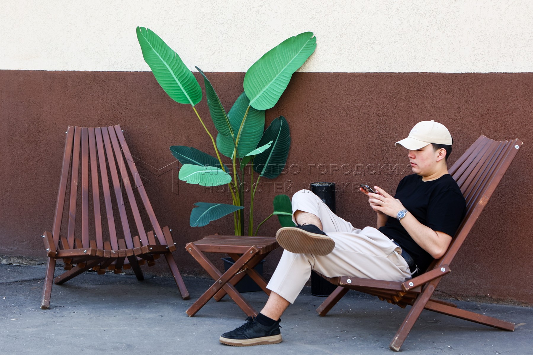 Теплая погода в Москве 1 апреля 2024 года. Молодой человек с мобильным телефоном.