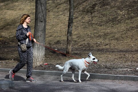 Теплая погода в Москве 1 апреля 2024 года. Женщина выгуливает собаку.