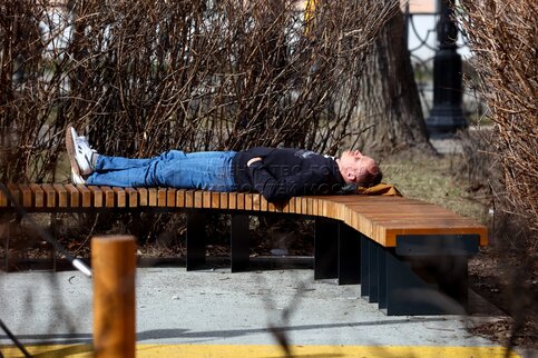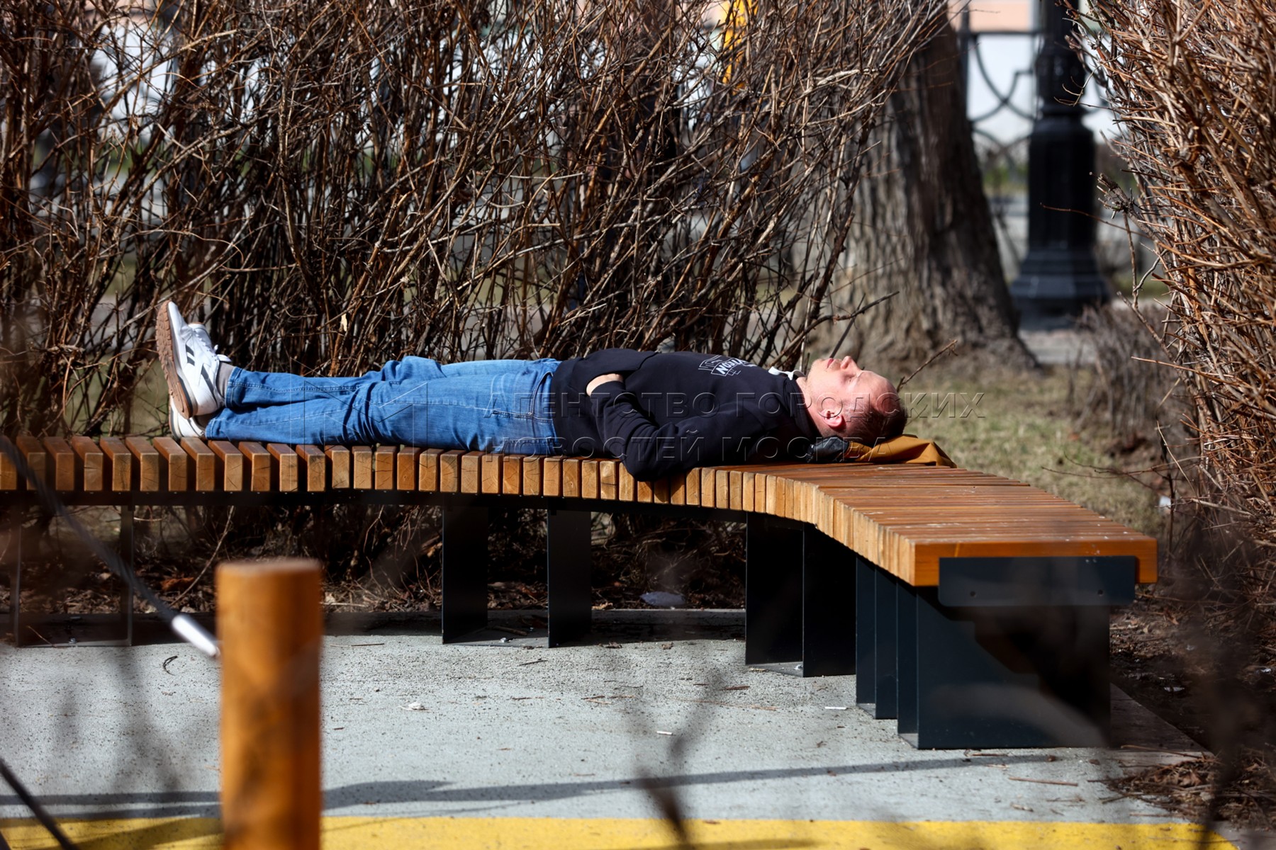 Теплая погода в Москве 1 апреля 2024 года. Собака на скамейке.