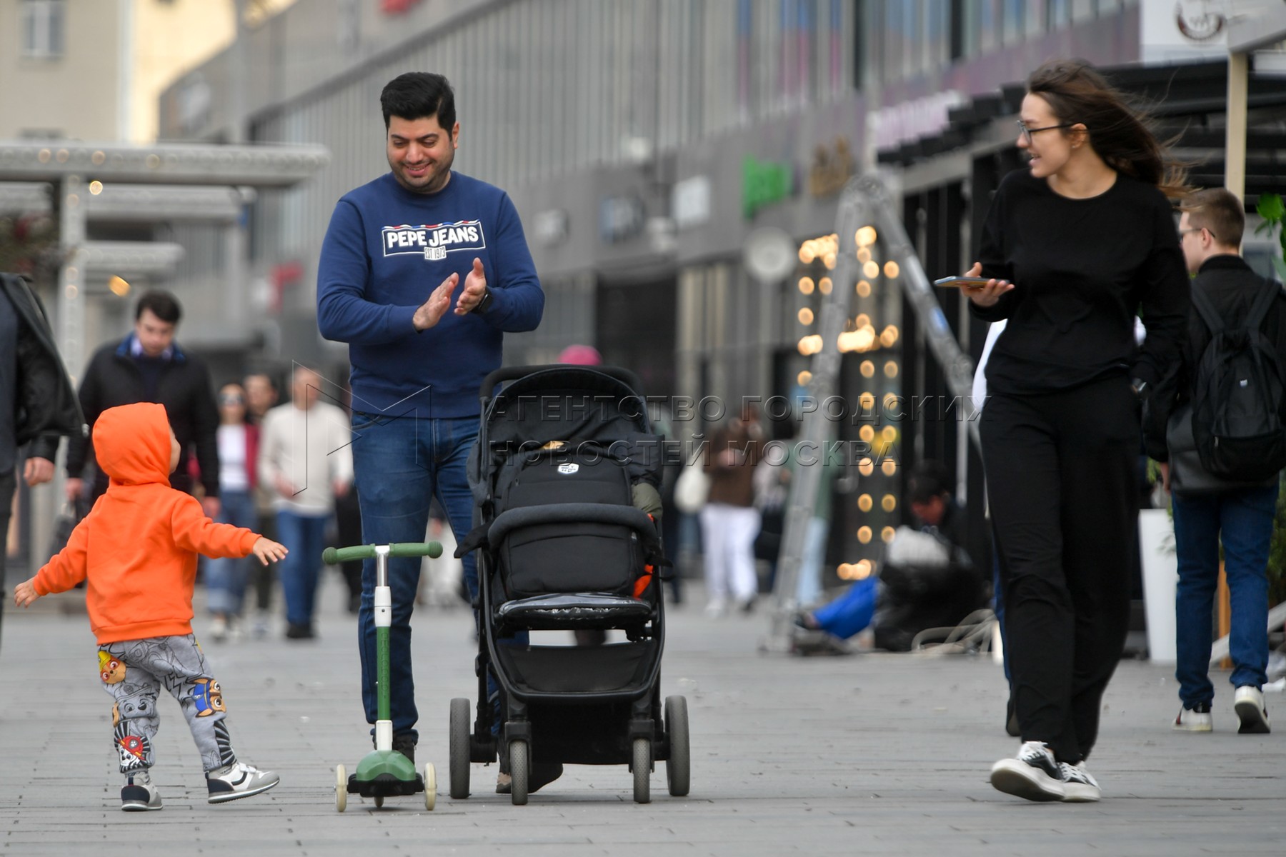Теплая погода в Москве 1 апреля 2024 года. Семья с детской коляской.