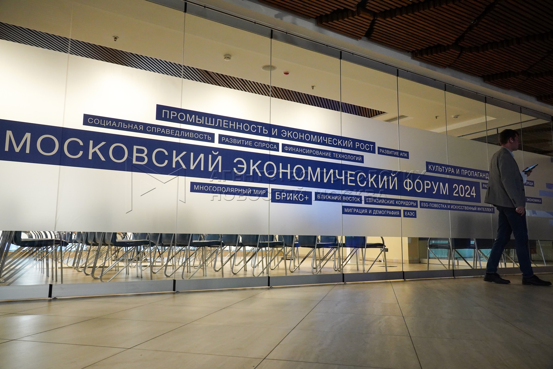Логотип Московского экономического форума на экране на территории Цифрового делов...