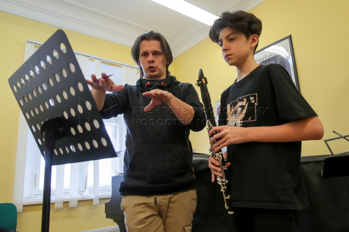 Преподаватель игры на кларнете Антон Прищепа (слева) во время урока в Московской ...