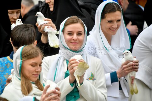 Верующие во время выпускания голубей после богослужения в праздник Благовещения П...