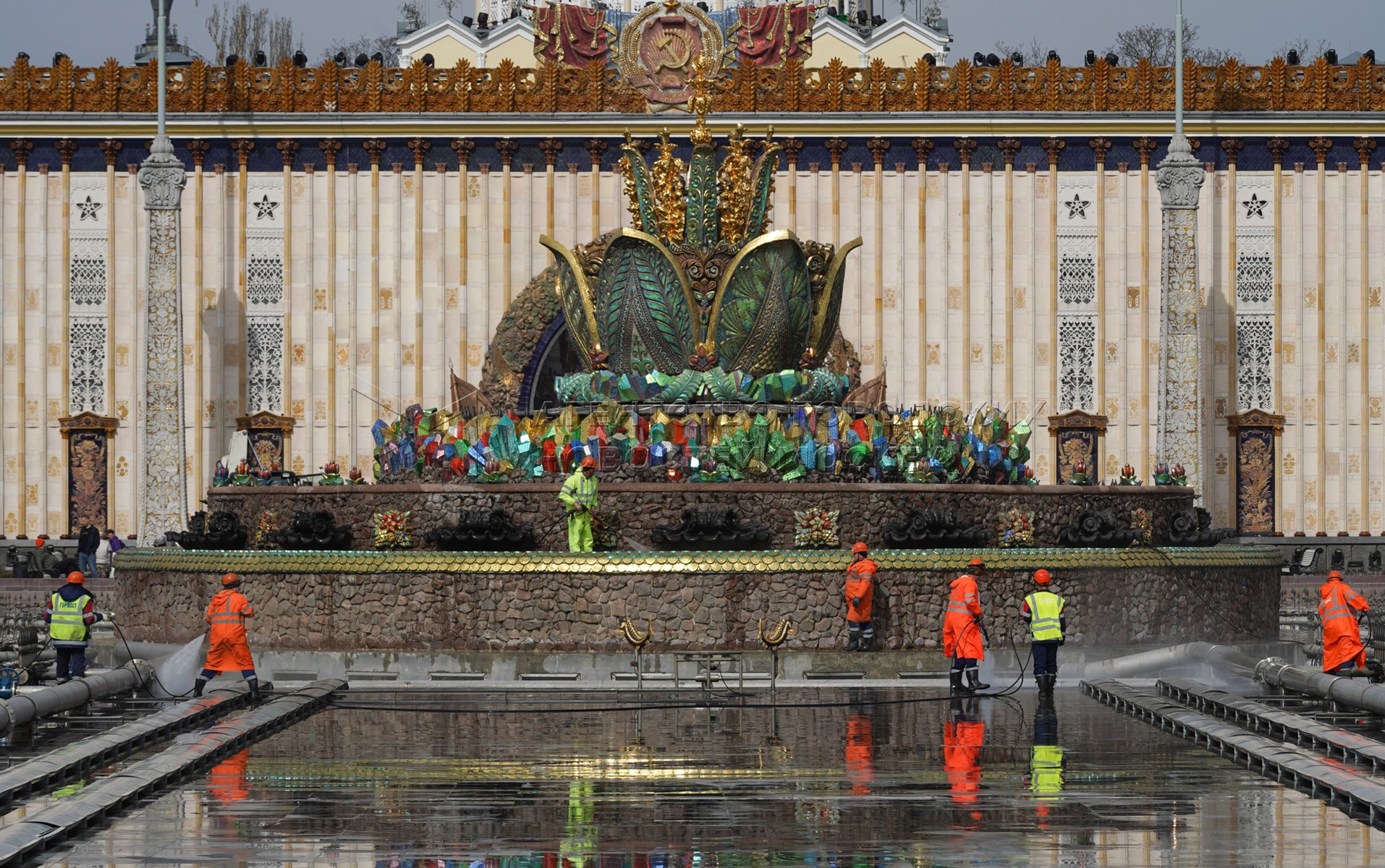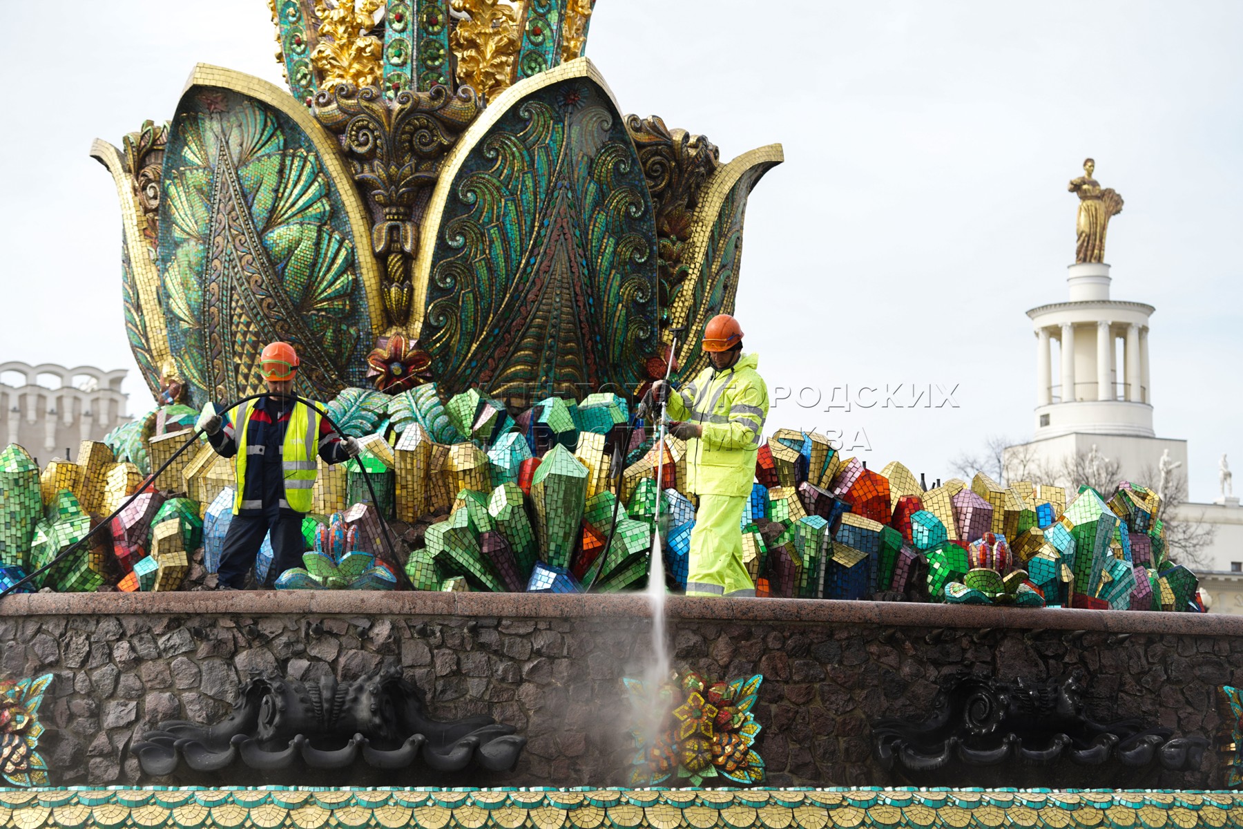 Промывка фонтана «Каменный цветок» на ВДНХ.