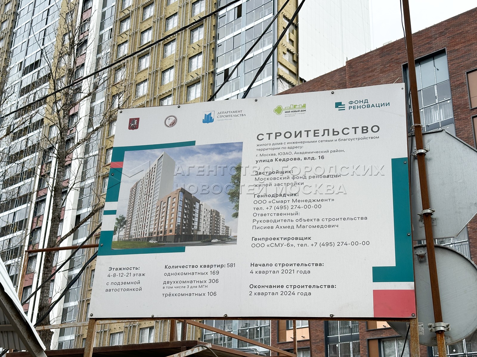 • Описание: Строительство дома по программе реновации на ул. Кедрова в Академическом районе на юго-западе Москвы.