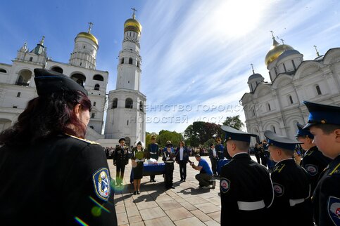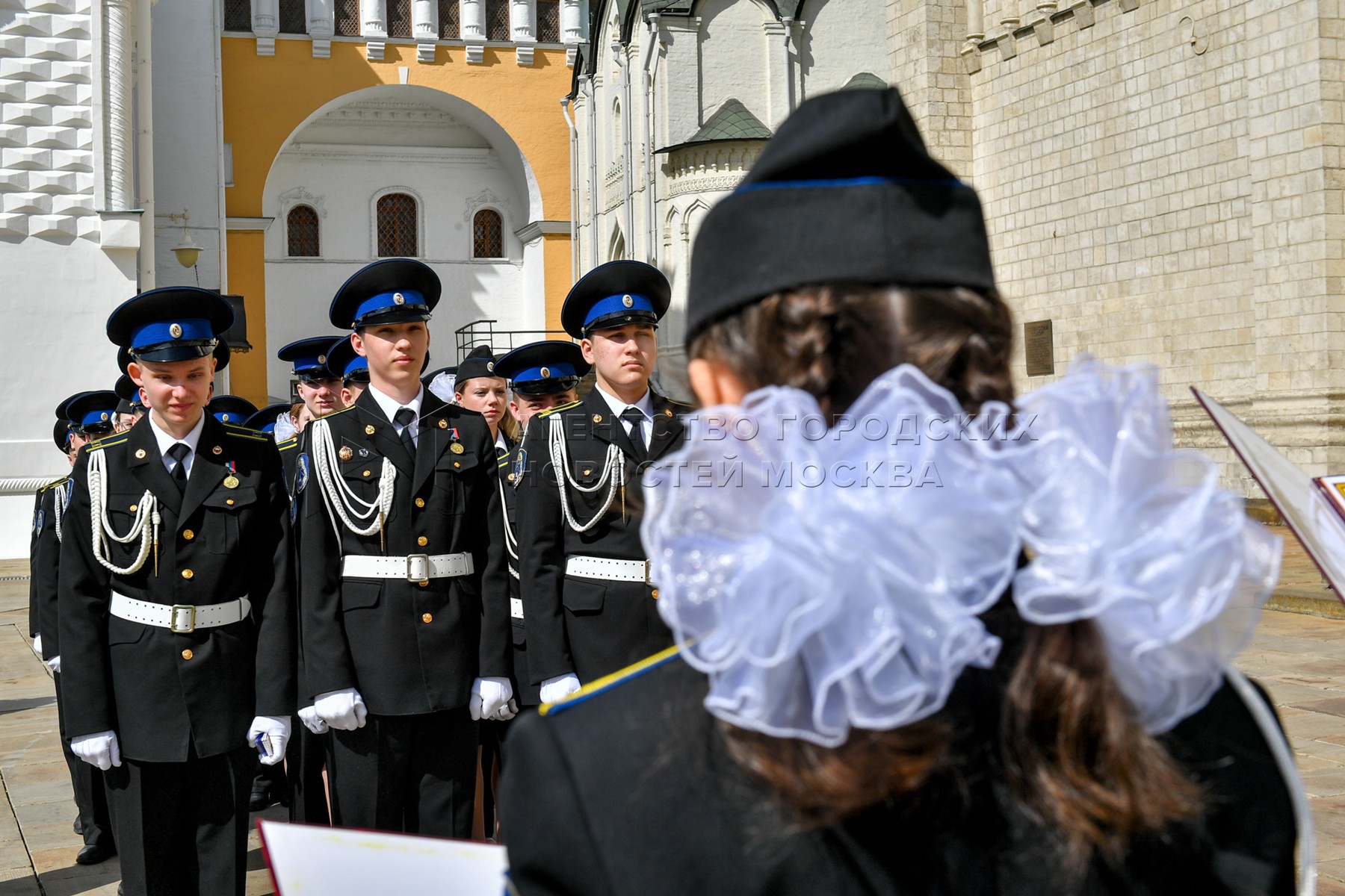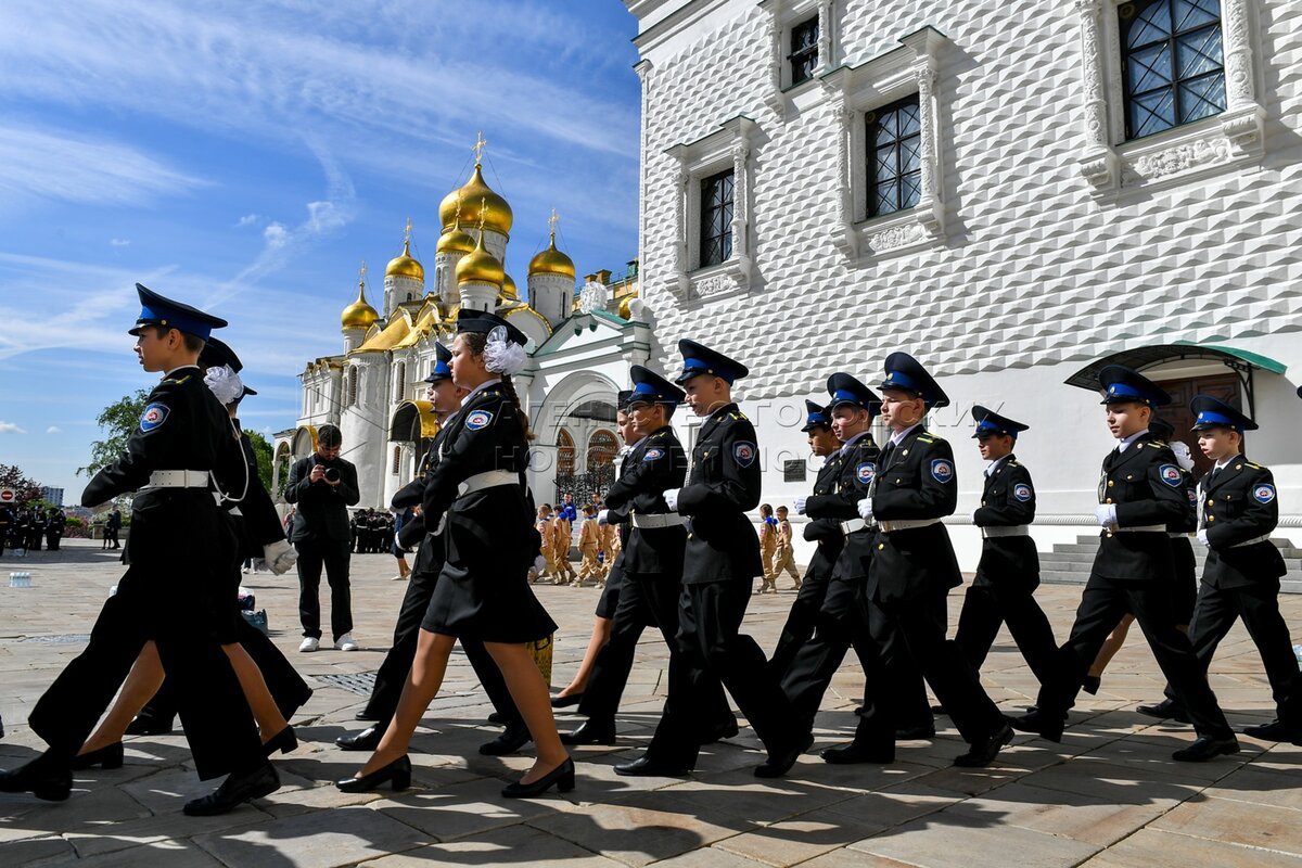 Церемония приведения к торжественным клятвам учащихся кадетских и юнармейских классов Федеральной службы охраны РФ (ФСО России) на Соборной площади Московского Кремля.
