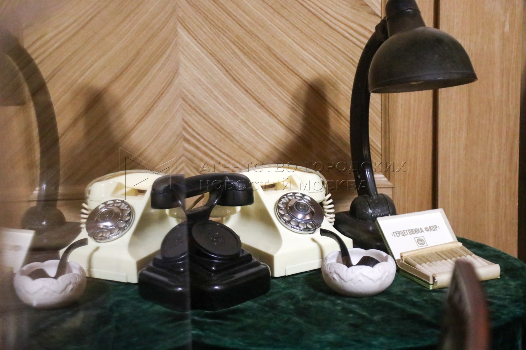 - Описание: Телефонный аппарат, курительные принадлежности, устройство для вызова персонала и настольная лампа из кабинета И.В. Сталина. Открытие в Музее Гаража особого назначения ФСО России на ВДНХ экспозиции с воссозданными интерьерами Ближней дачи Сталина.