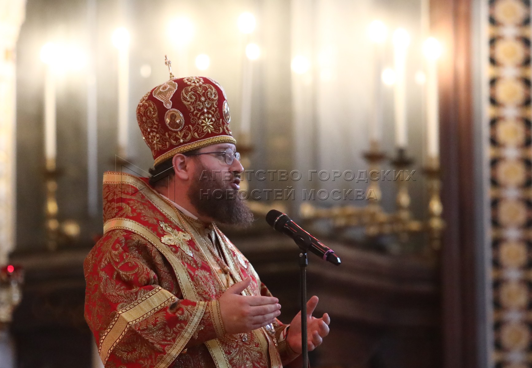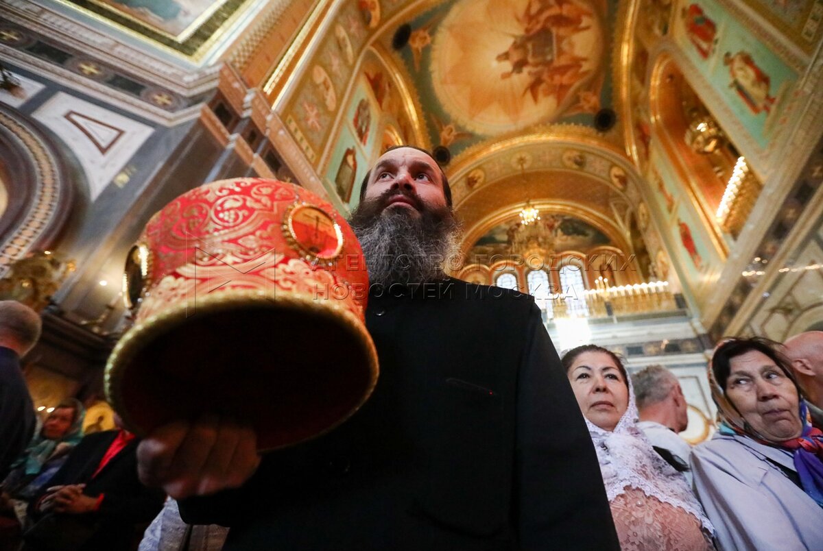 Священнослужитель во время Божественной литургии в день памяти святых равноапосто...