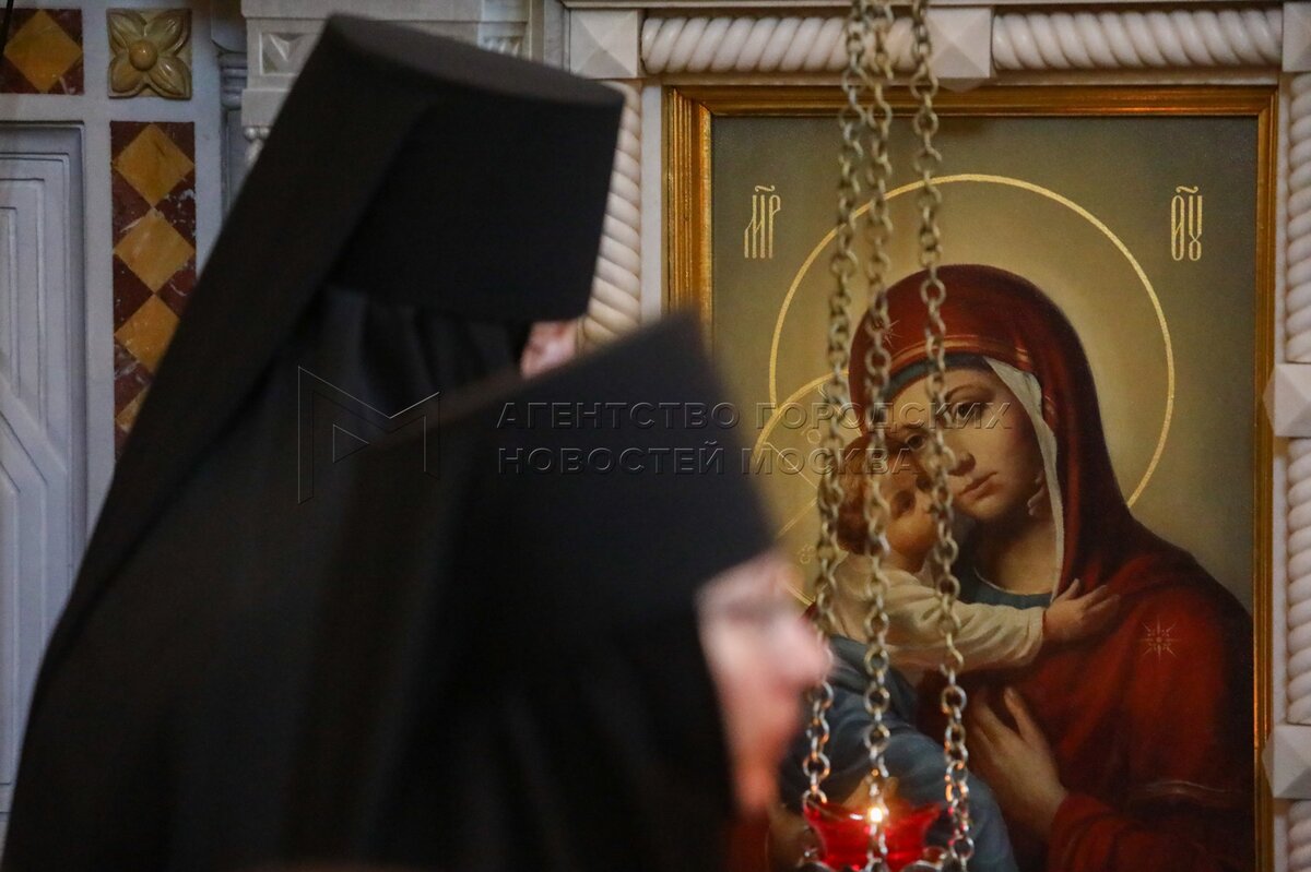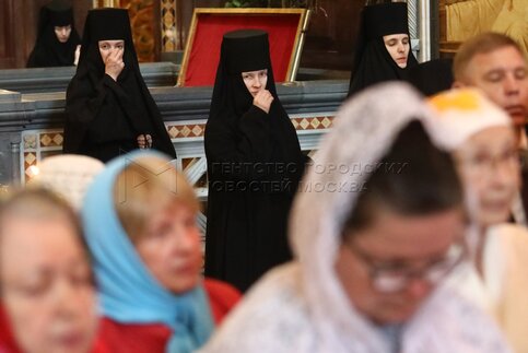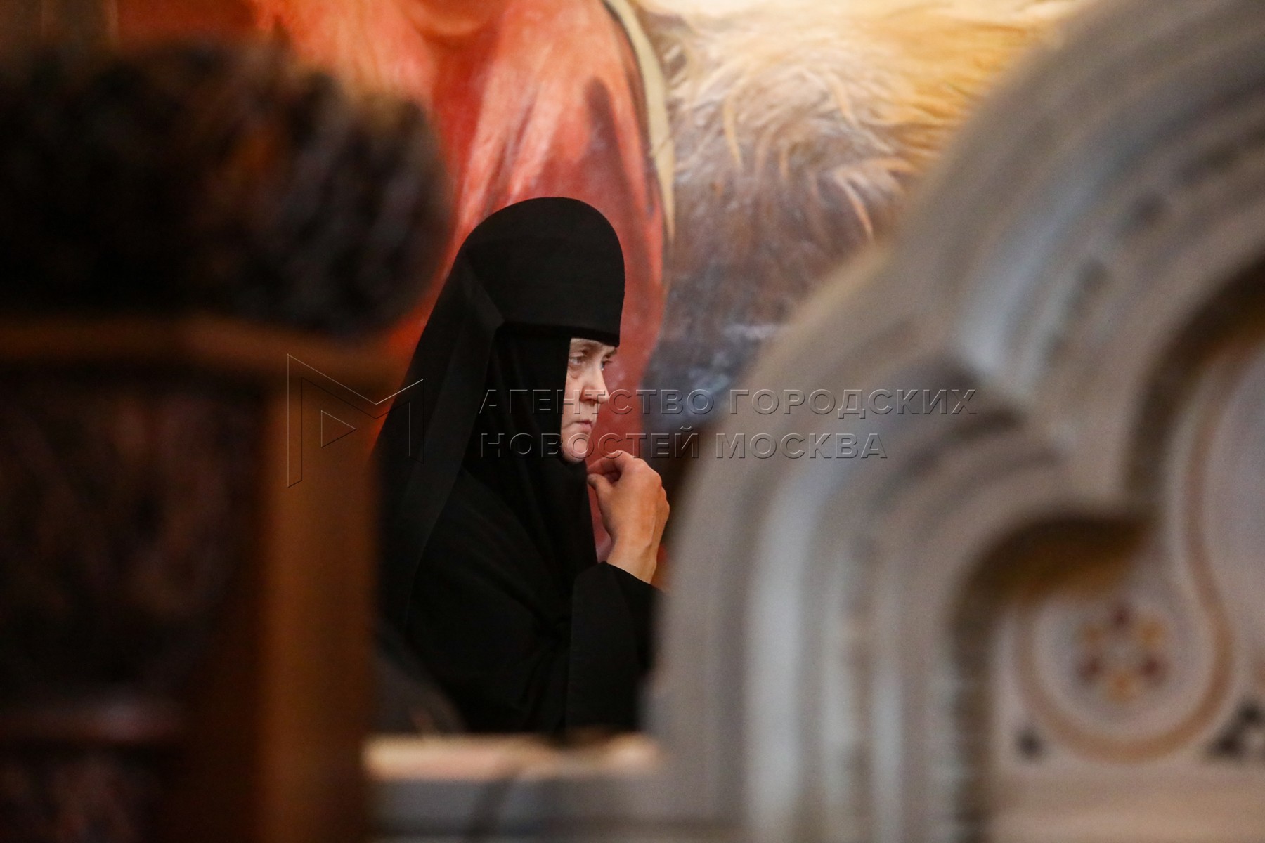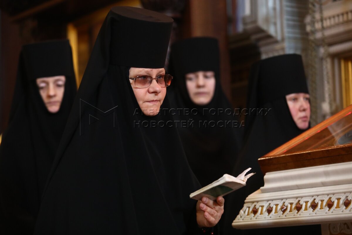 Монахини во время Божественной литургии в день памяти святых равноапостольных Меф...