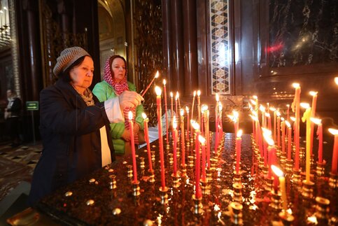 Прихожанки возле кануна. Божественная литургия в день памяти святых равноапостоль...