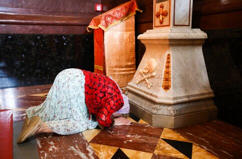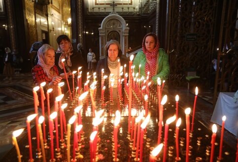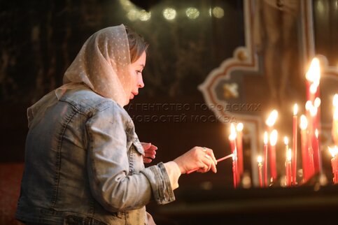 Верующая во время Божественной литургии в день памяти святых равноапостольных Меф...