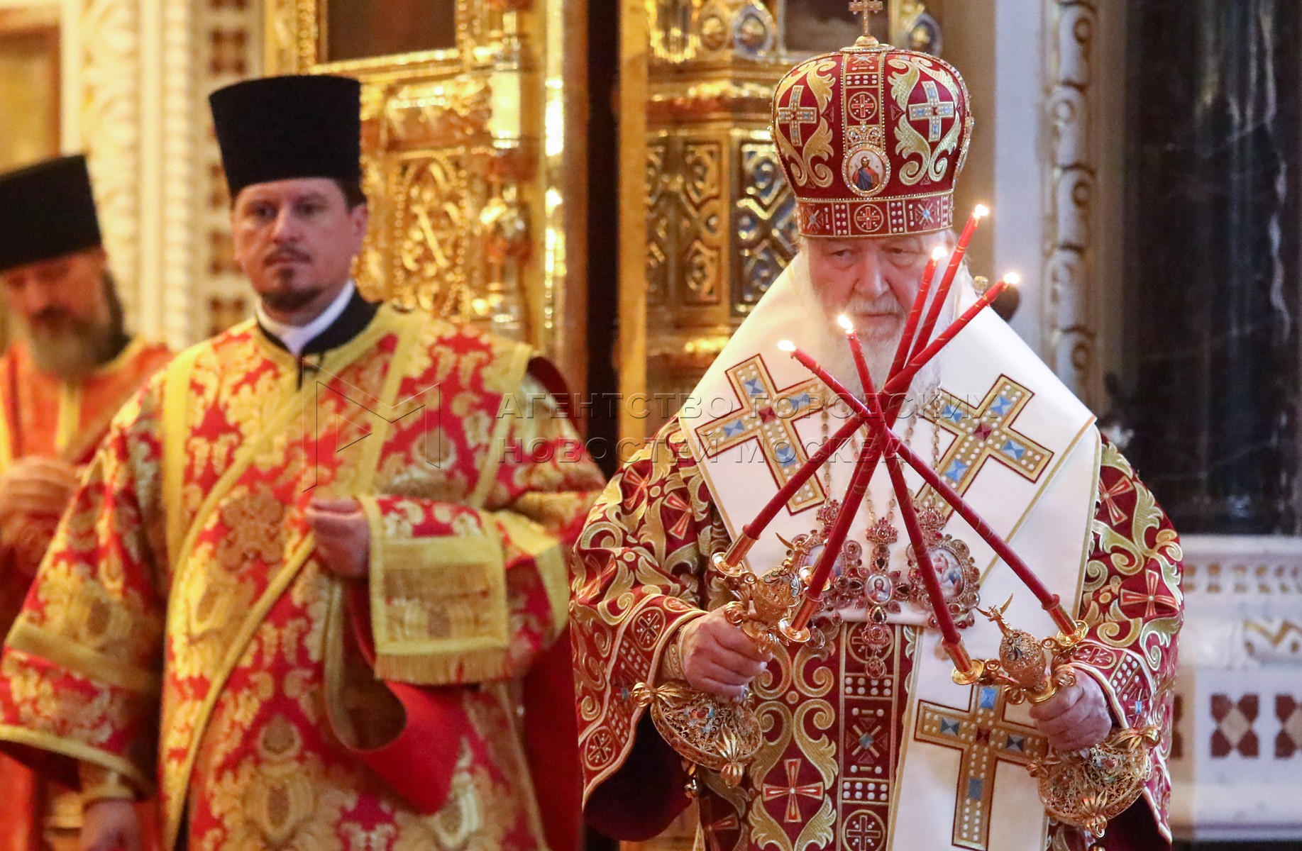 Патриарх Московский и всея Руси Кирилл (слева по центру) в кафедральном соборном ...