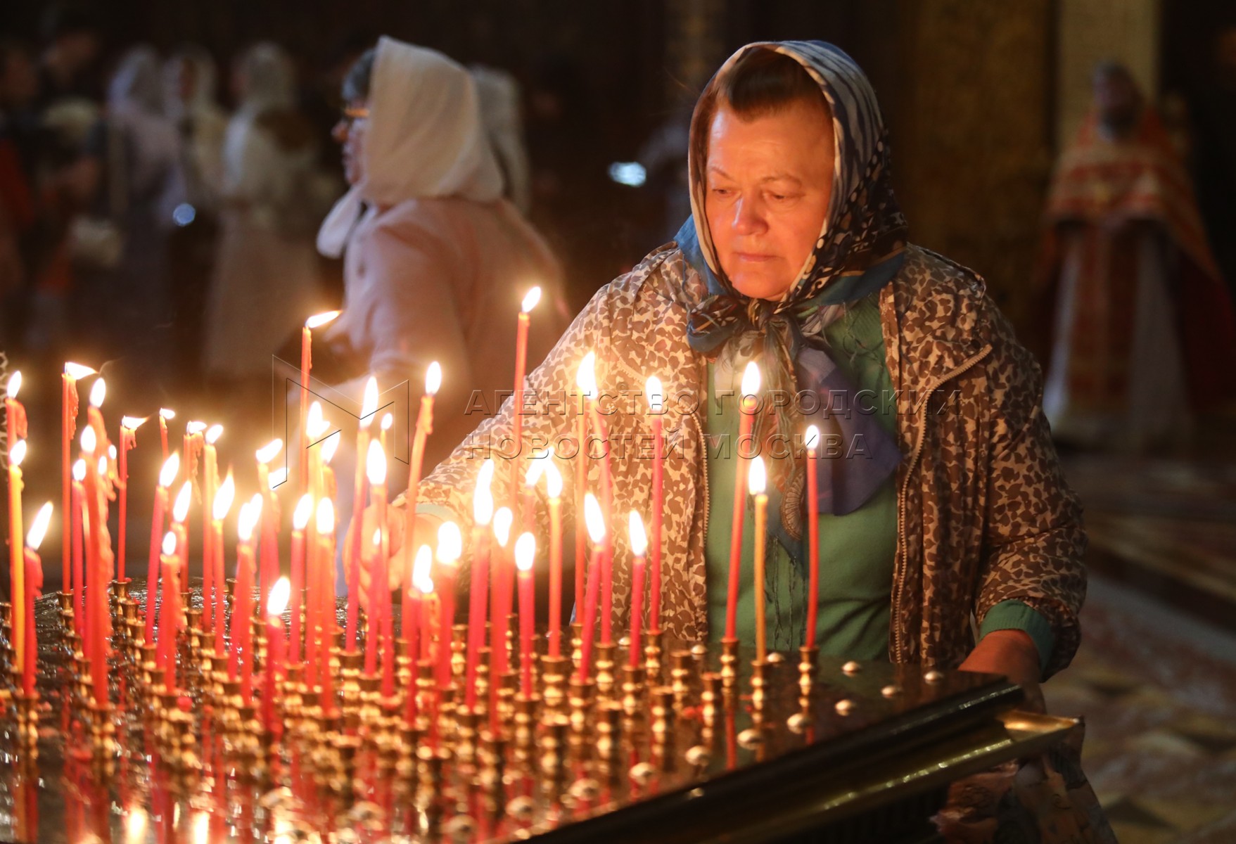 Прихожанка у подсвечника. Божественная литургия в день памяти святых равноапостол...