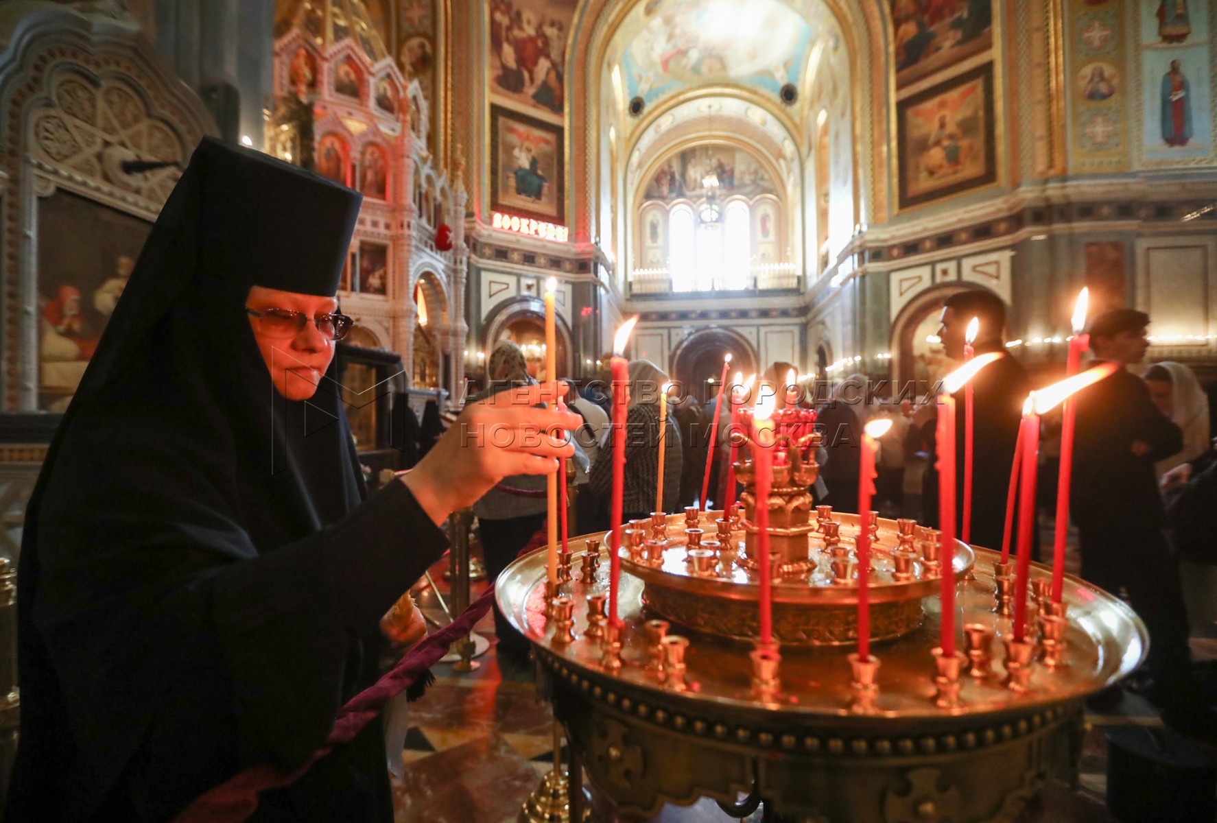 Монахиня возле подсвечника. Божественная литургия в день памяти святых равноапост...