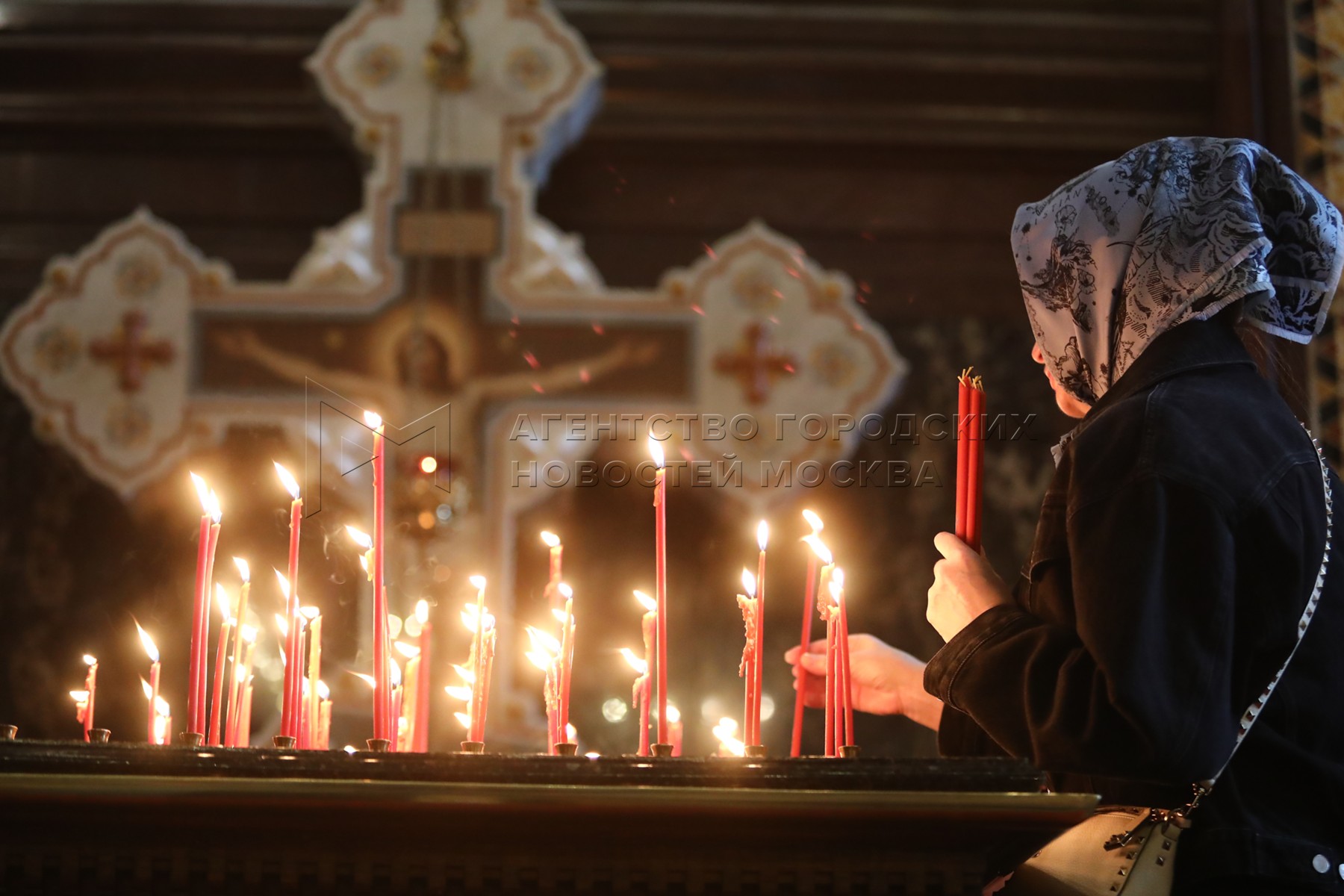Прихожанка возле кануна. Божественная литургия в день памяти святых равноапостольных Мефодия и Кирилла в кафедральном соборном храме Христа Спасителя.