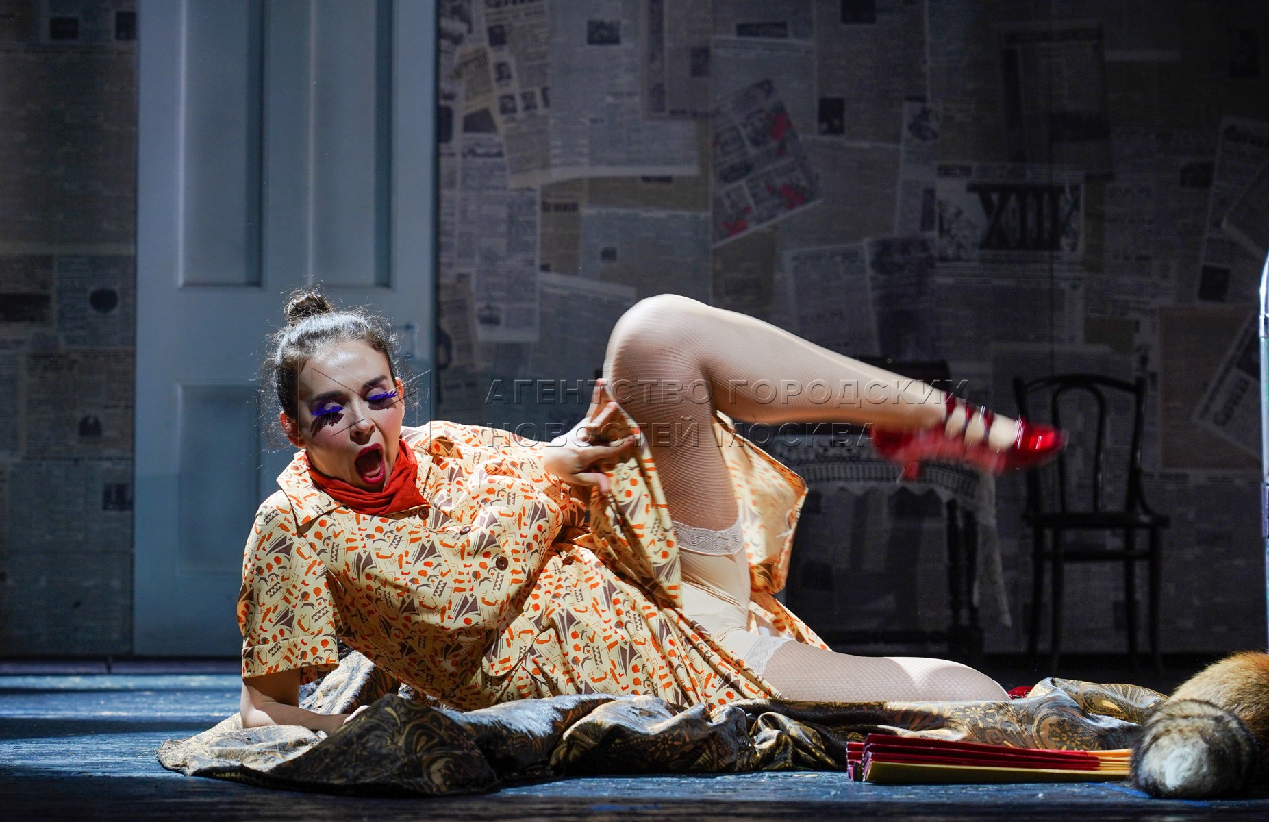 - Описание: Актриса Лиана Ермакова в роли Ульяны Андреевны, жены Бунши во время показа спектакля с тифлокомментированием «Иван Васильевич» по произведению Михаила Булгакова в Московском академическом театре сатиры, организованного совместно с благотворительным фондом «Искусство, наука и спорт» в рамках программы поддержки людей с нарушением зрения «Особый взгляд».