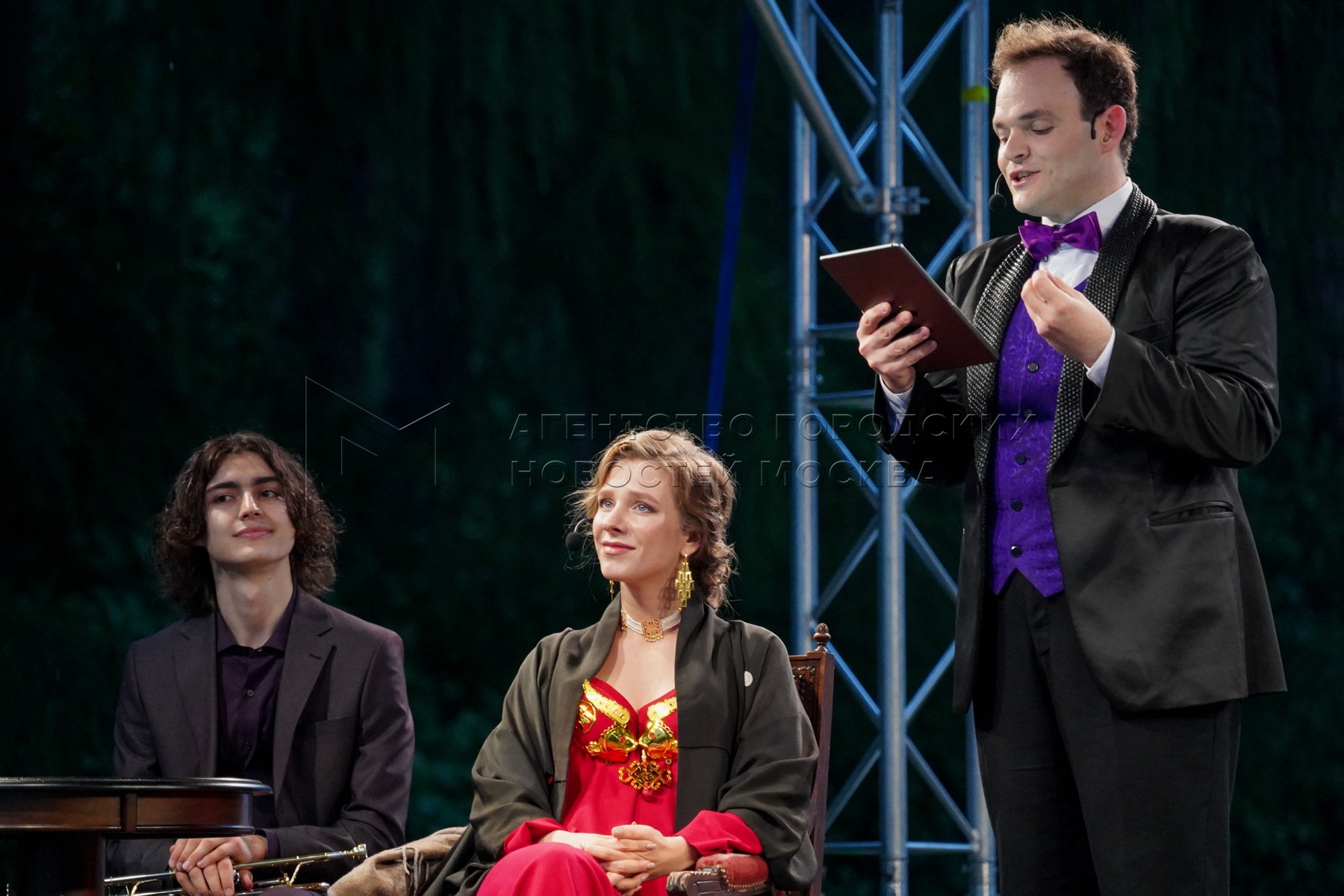- Описание: Музыкант Ильяс Невретдинов, актриса Елизавета Арзамасова, ведущий, артист Московского театра оперетты Александр Бабик (слева направо) на XXXIII церемонии награждения первой театральной премией «Хрустальная Турандот» в музее-усадьбе «Архангельское».