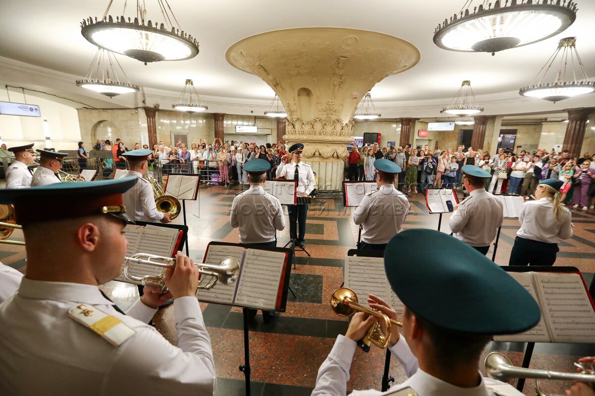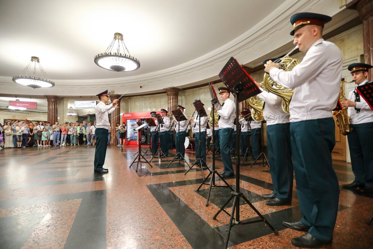 Выступление оркестра штаба Центрального округа войск национальной гвардии Российской Федерации в Московском метрополитене в День России, 12 июня 2024 года.