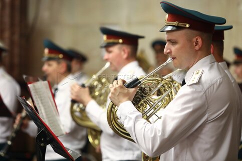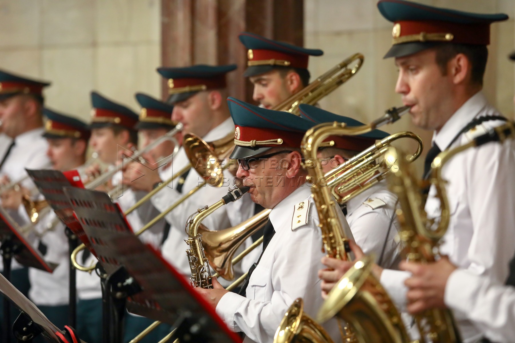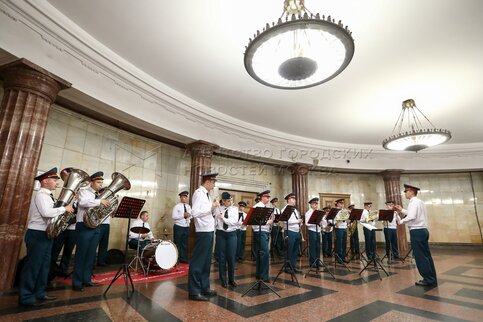 - Описание: Выступление оркестра штаба Центрального округа войск национальной гвардии Российской Федерации в Московском метрополитене в День России, 12 июня 2024 года.