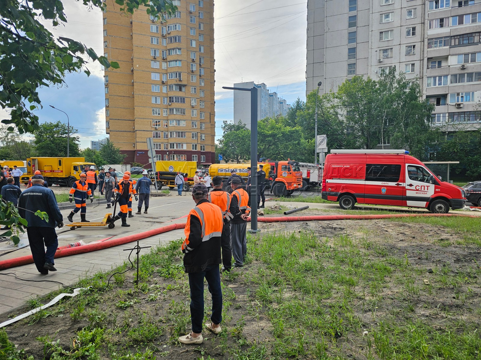 Работа коммунальных и оперативных служб по откачке воды после сильного ливня из подземного паркинга в ЖК на ул. Лобненская.