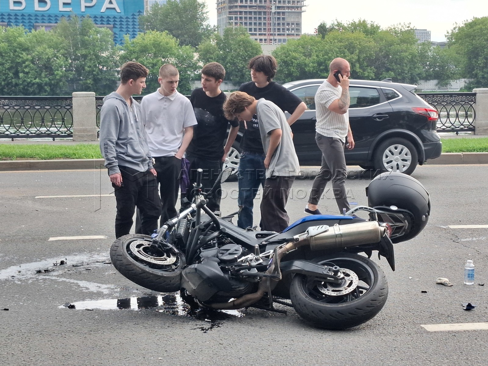 Последствия ДТП с участием кроссовера Mercedes и мотоциклиста на Даниловской набережной на юге Москвы. Мотоциклиста увезла скорая помощь.