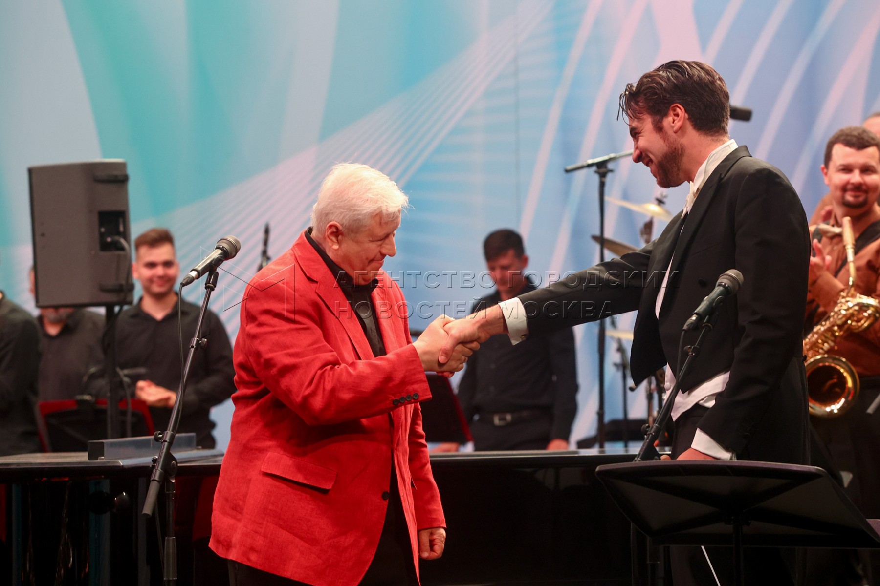 • Описание: Художественный руководитель и главный дирижер оркестра джазовой музыки имени Олега Лундстрема – Борис Фрумкин (слева). Закрытие II Московского летнего музыкального фестиваля «Зарядье» в большом амфитеатре под открытым небом.