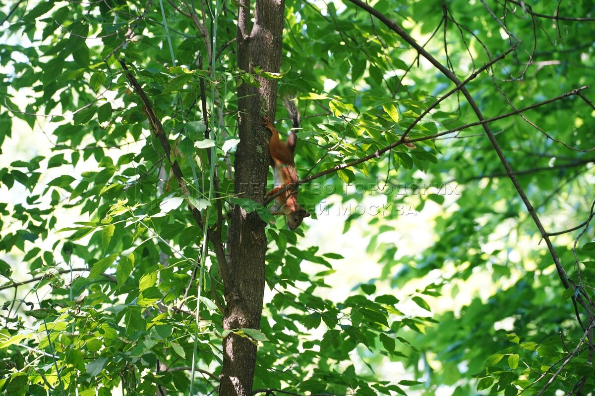 Белка на дереве. Летний сезон в парке «Лосиный остров». Экоцентр «Красная сосна».