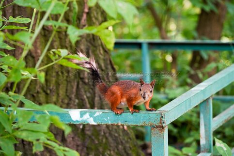 Белка на дереве возле кормушки. Летний сезон в парке «Лосиный остров». Экоцентр «...