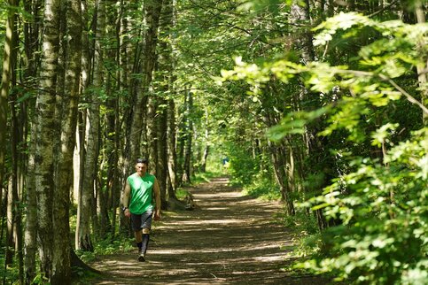 Мужчина занимается скандинавской ходьбой. Летний сезон в парке «Лосиный остров». ...