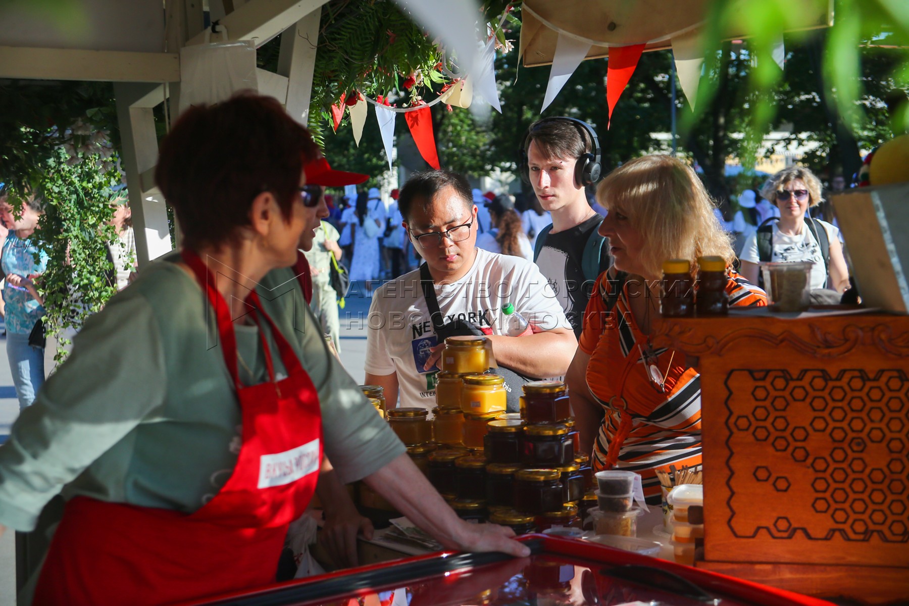 Покупатели возле прилавка с медом. Гастрономический фестиваль «Вкусы России» на В...