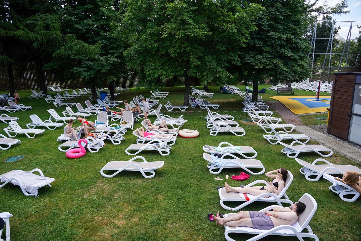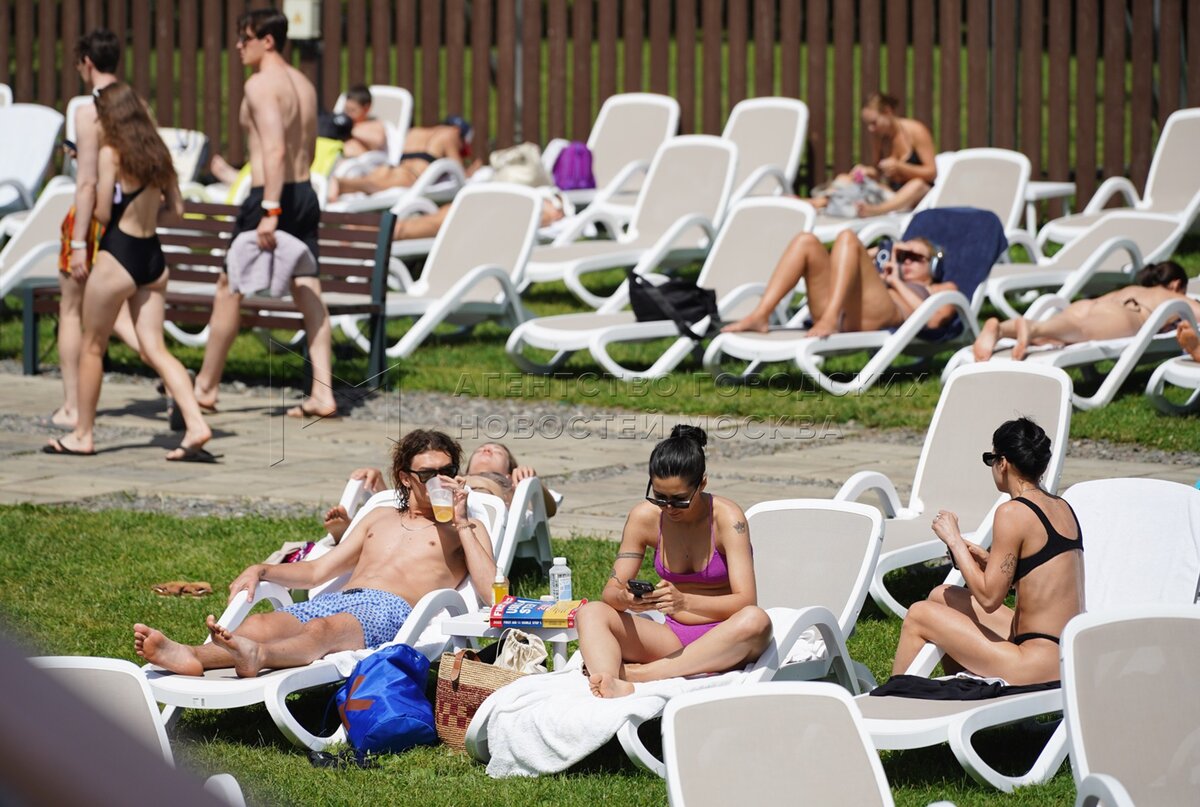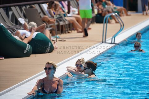 Люди на шезлонгах у открытого летнего бассейна в «Лужниках».