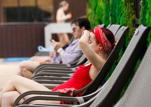 Женщина в шезлонге у открытого летнего бассейна в «Лужниках».