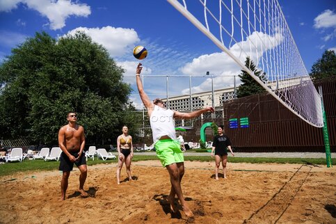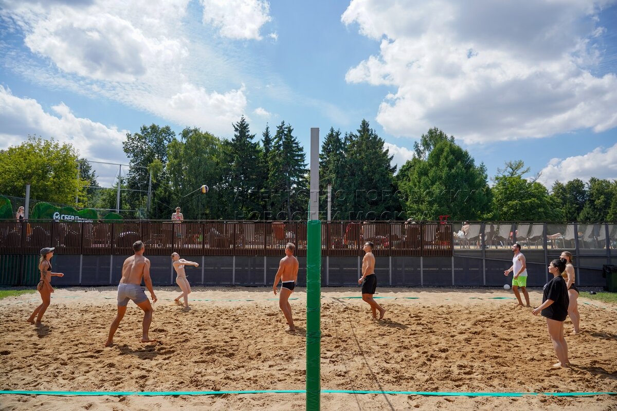 Люди играют в волейбол у открытого летнего бассейна в «Лужниках».