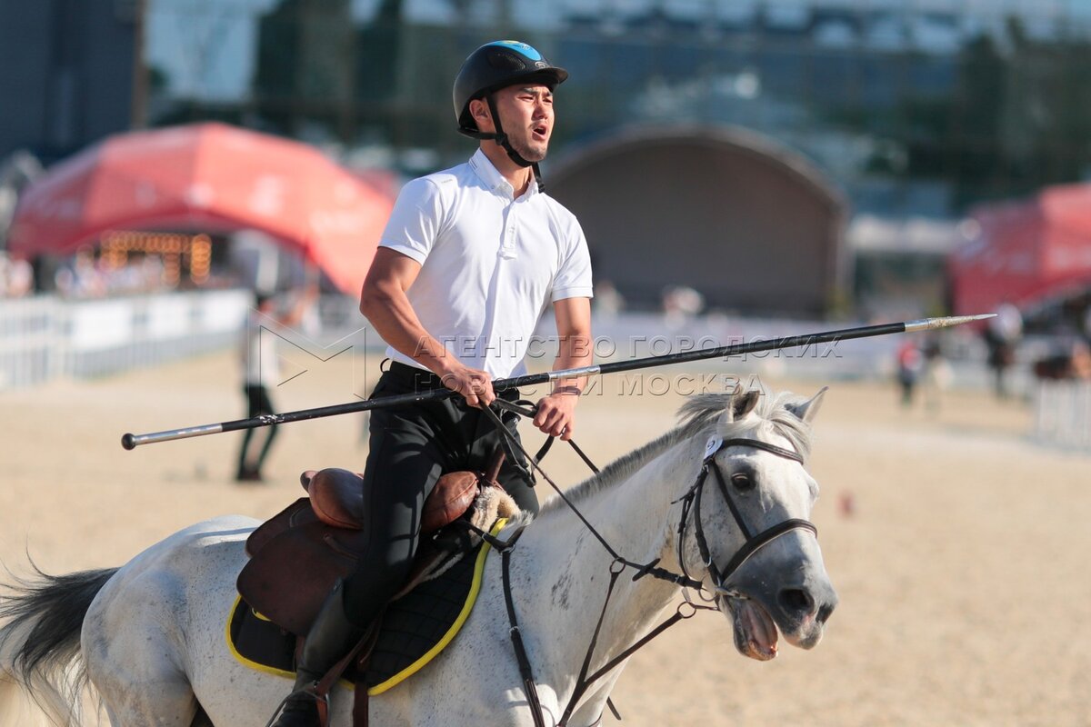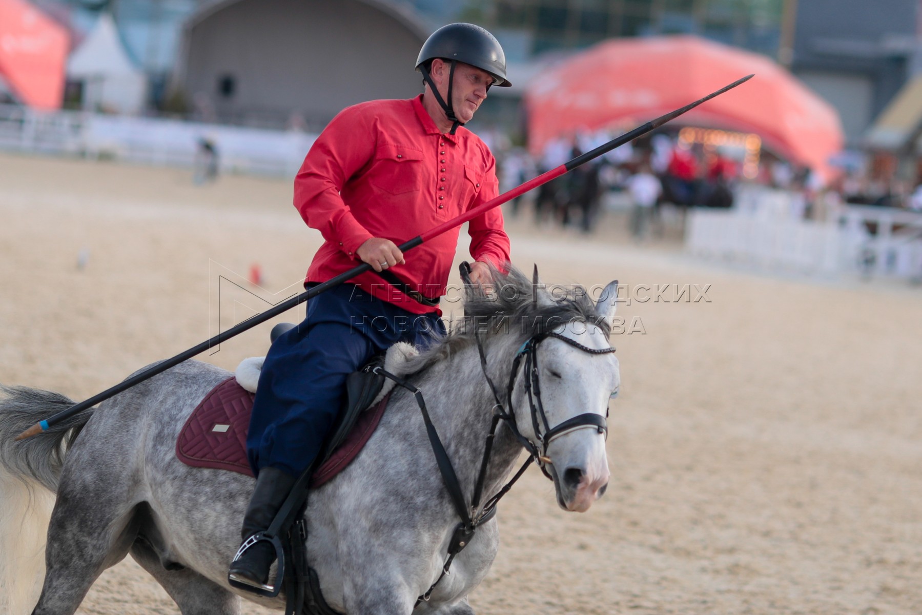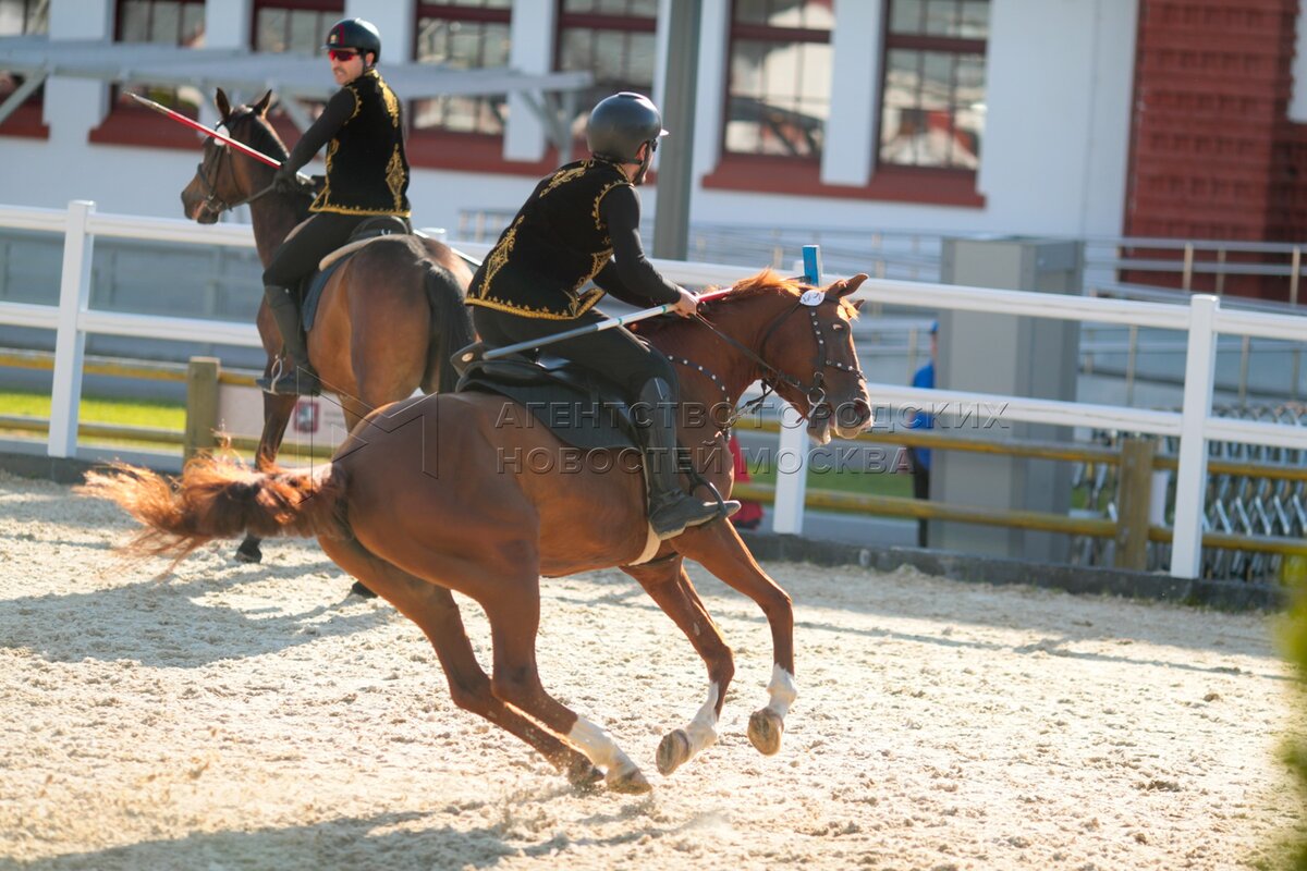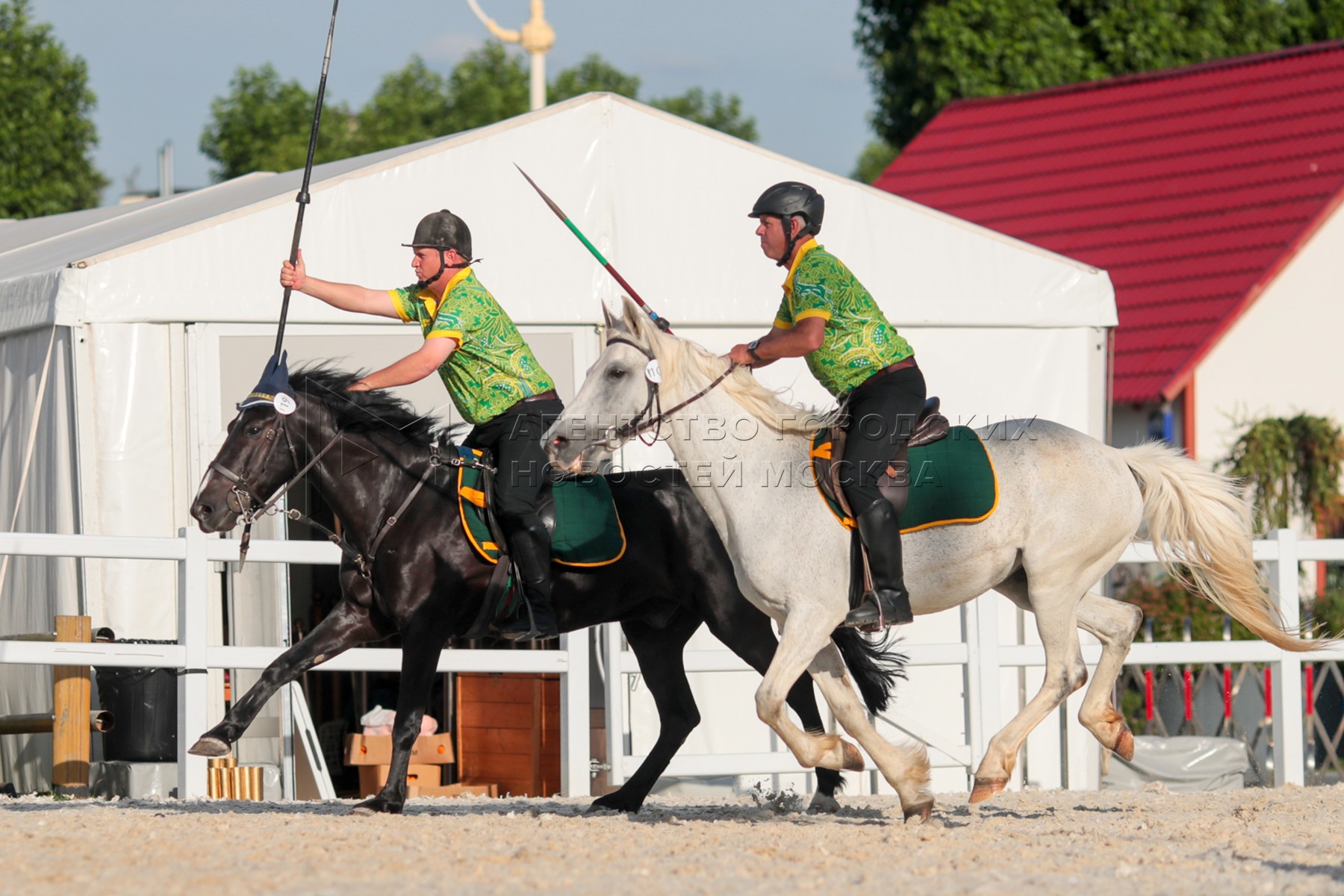 Показательные тренировки команд перед началом международных соревнований по тентпеггингу – вид конного спорта, когда всадники на полном скаку прокалывают маленький предмет на земле – пег (колышек), а затем на острие оружия уносят с собой заканчивая упражнение.