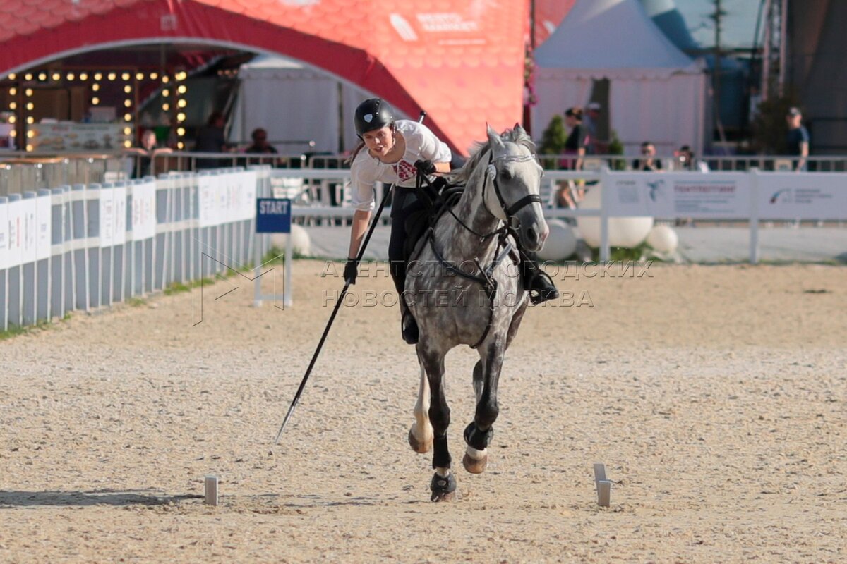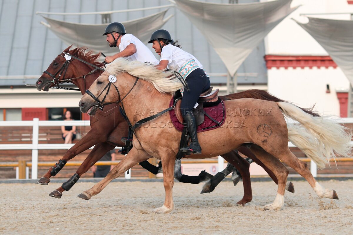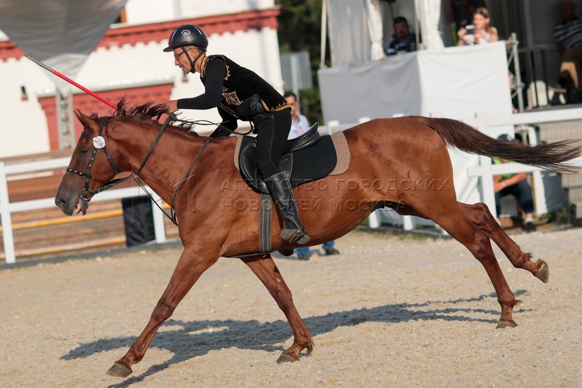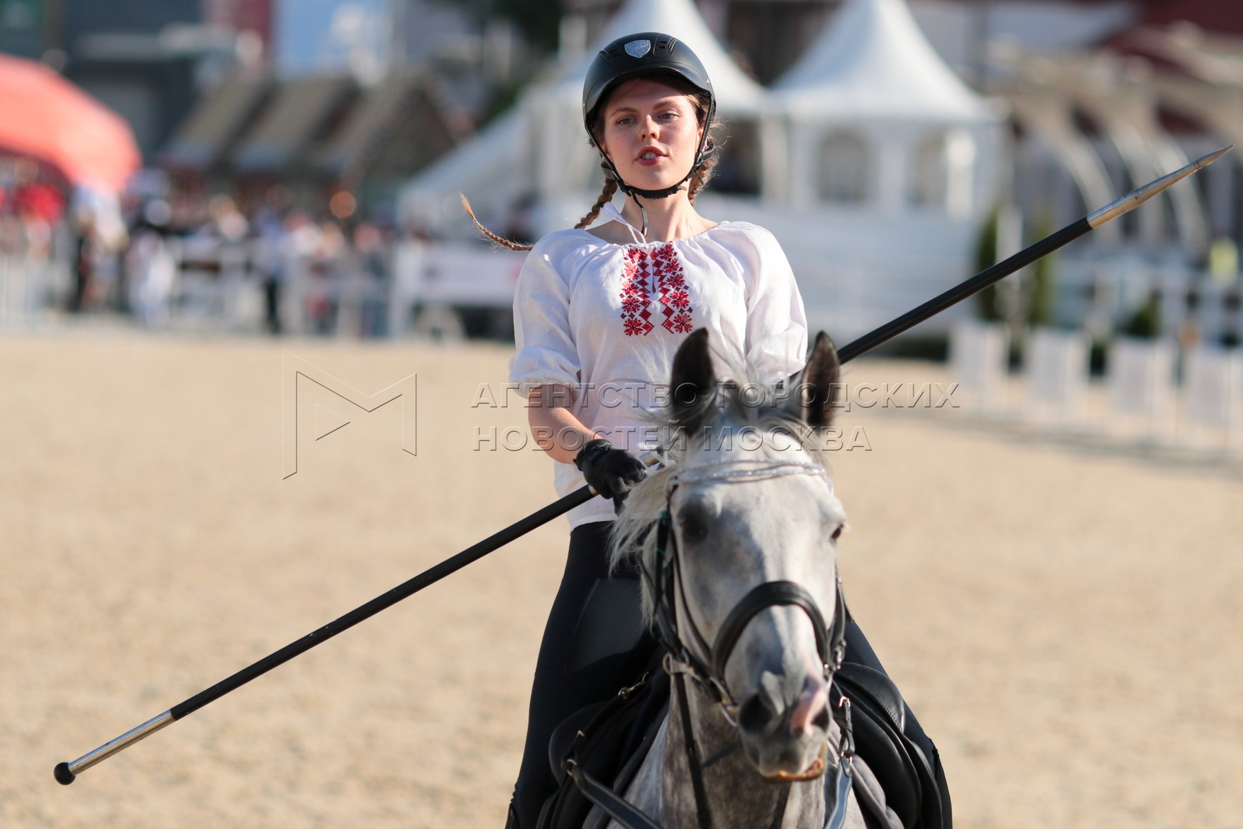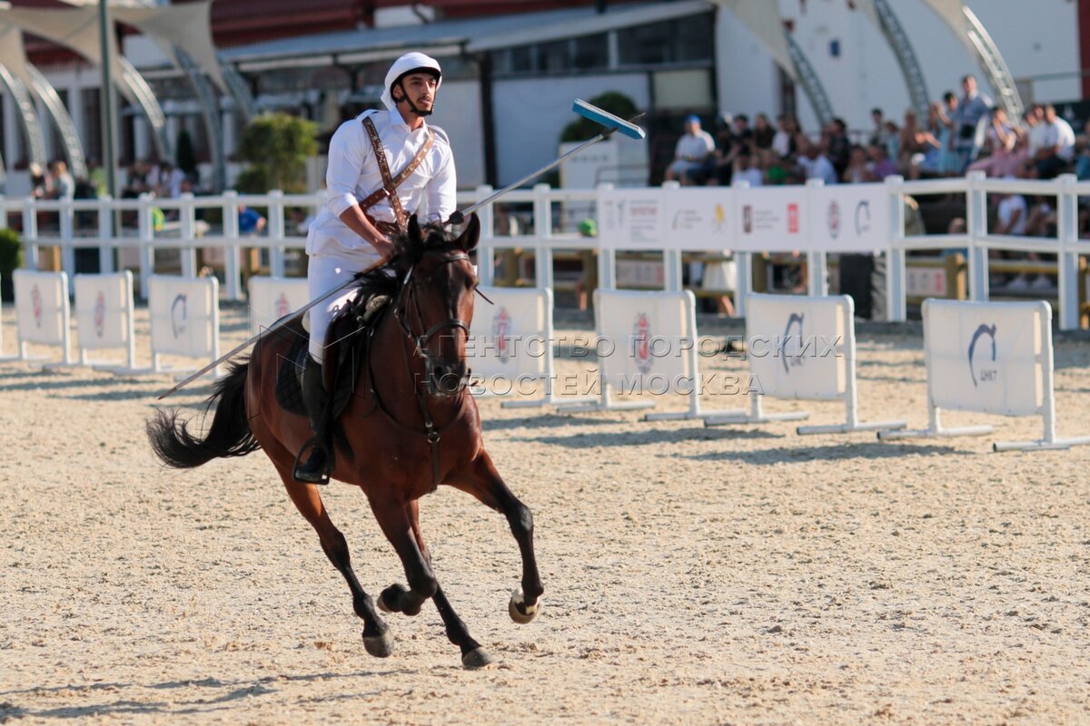 Показательные тренировки команд перед началом международных соревнований по тентпеггингу – вид конного спорта, когда всадники на полном скаку прокалывают маленький предмет на земле – пег (колышек), а затем на острие оружия уносят с собой заканчивая упражнение.